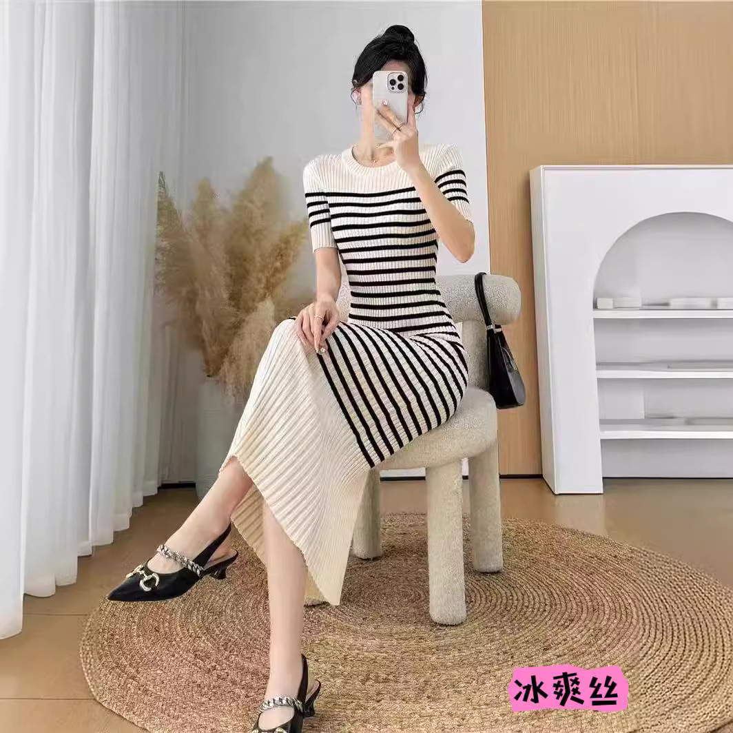 フランスのレトロなストライプの半袖の長いニットのワンピースの女性の春夏の新型の気質はやせている高級な包みの尻の長いスカートを現します。