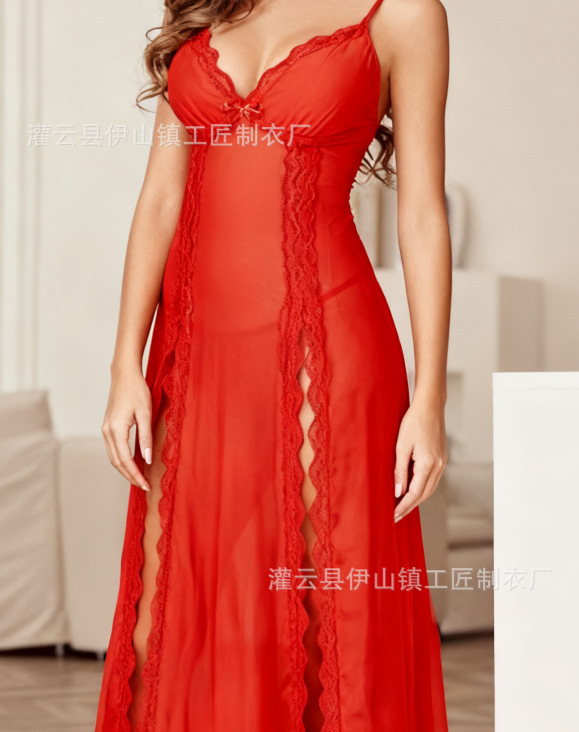 秋冬の女性用セクシーランジェリー、透け感のあるレースの誘惑ナイトガウン、花柄のサスペンダーセット