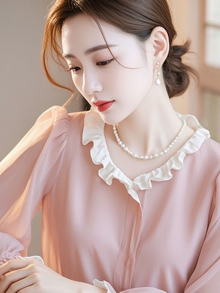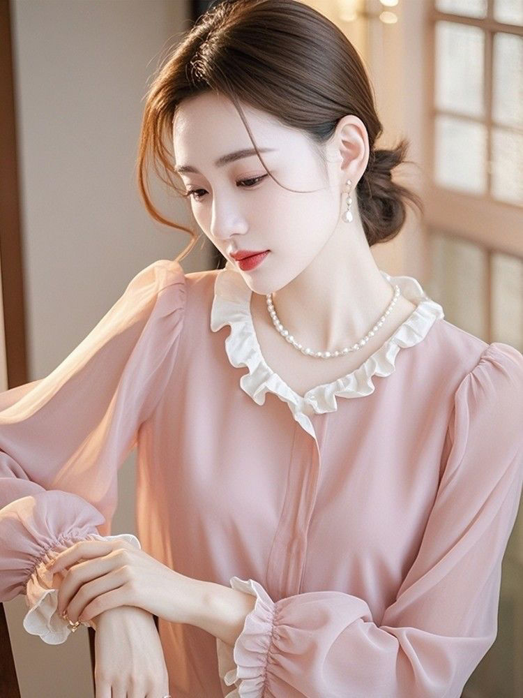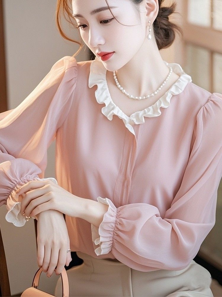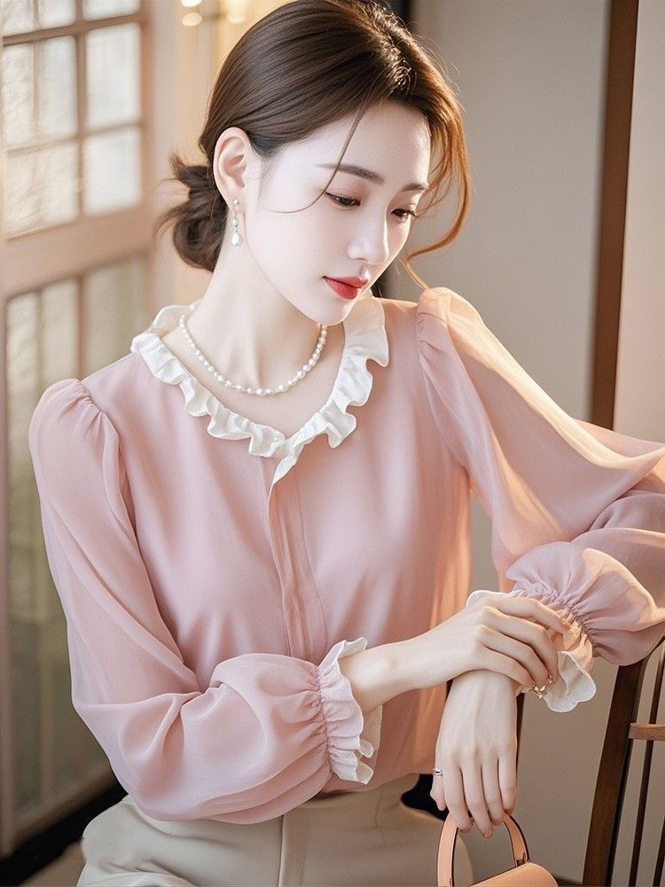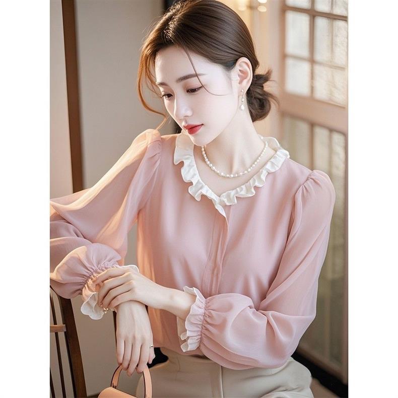 2024 新しいユニークで美しいトップスライト高級ハイエンドフレンチスタイル通勤ピンク長袖シャツ女性初秋