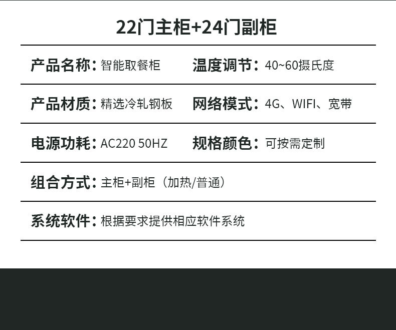 仕様 22ドアメインキャビネット,24ドアサブキャビネット,メイン 1 台、補助 1 台、ドア 46 枚,22ドアメインキャビネット(加熱バージョン),24ドア補助キャビネット(加熱バージョン),メイン 1 台、補助 1 台、ドア 46 枚 (急速加熱)