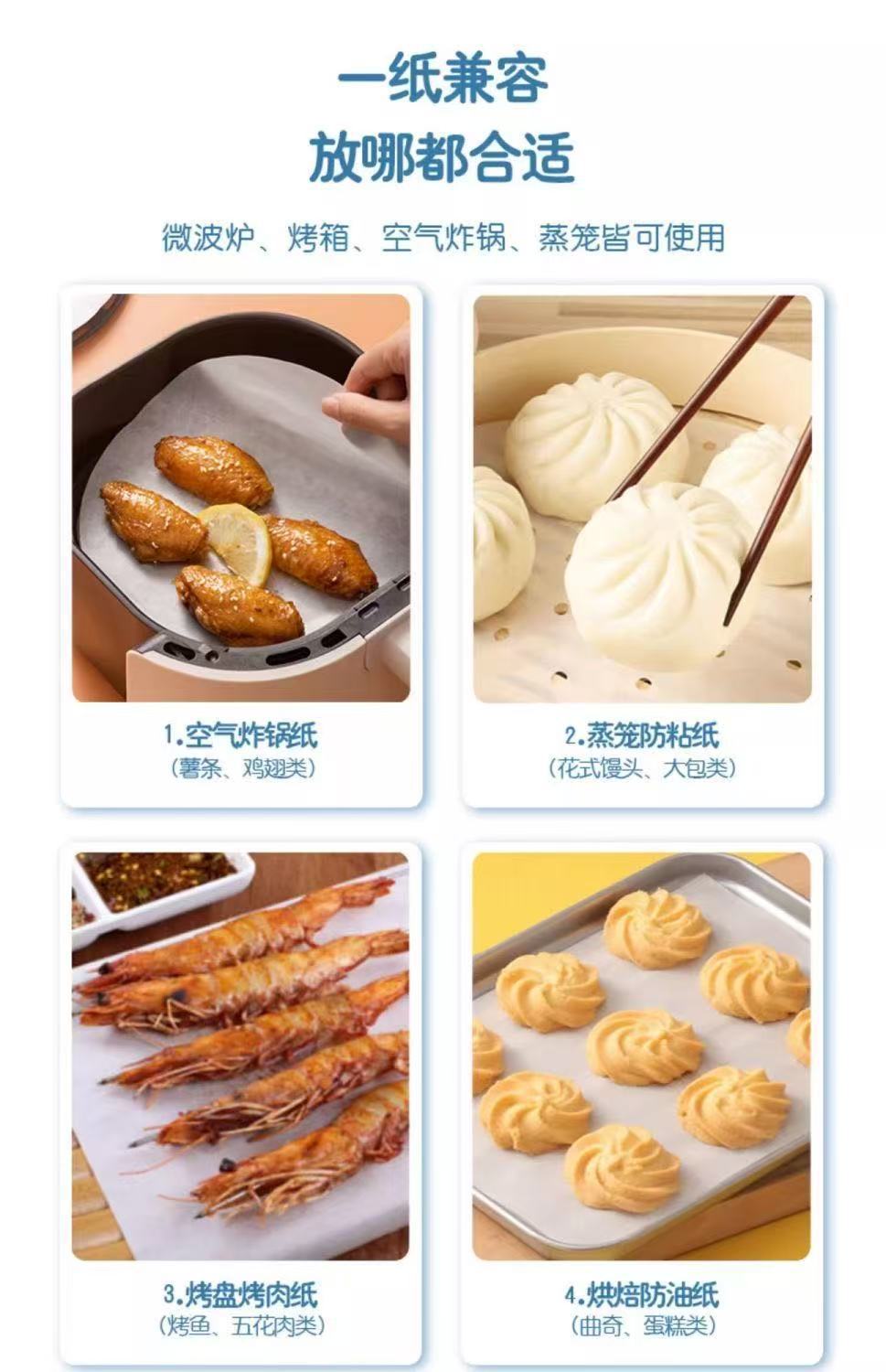 食品グレードのエアフライヤー専用紙、油吸収紙、家庭用食品用シリコーンオイルペーパー、ベーキングペーパートレイを直接供給