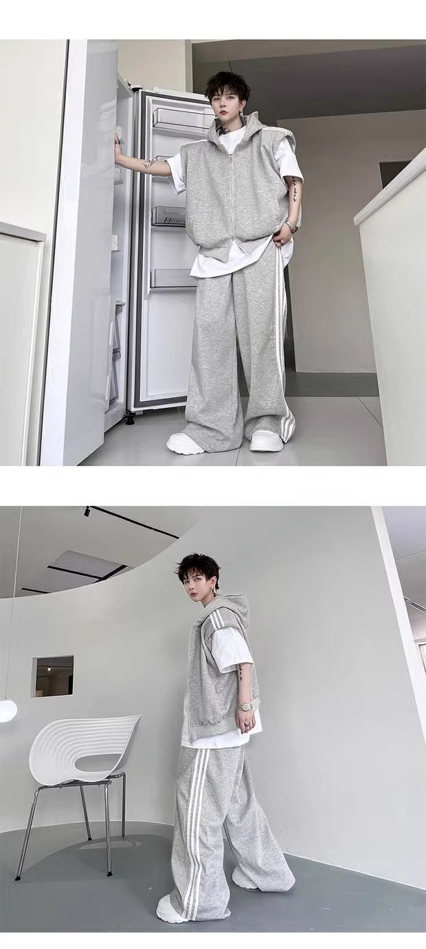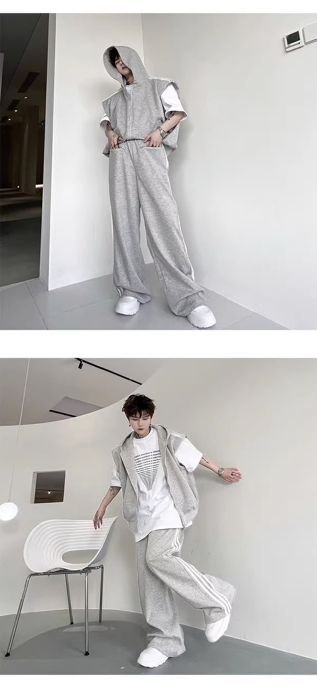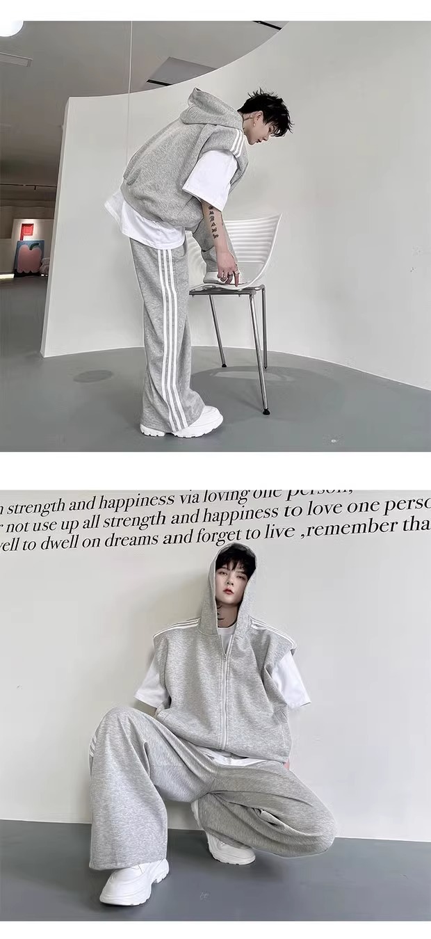 2025年夏服三本のスポーツスーツの男性は帽子をかぶって肩の馬甲の広い足のズボンのゆったりとしたカジュアルな2つのセットを敷きます。