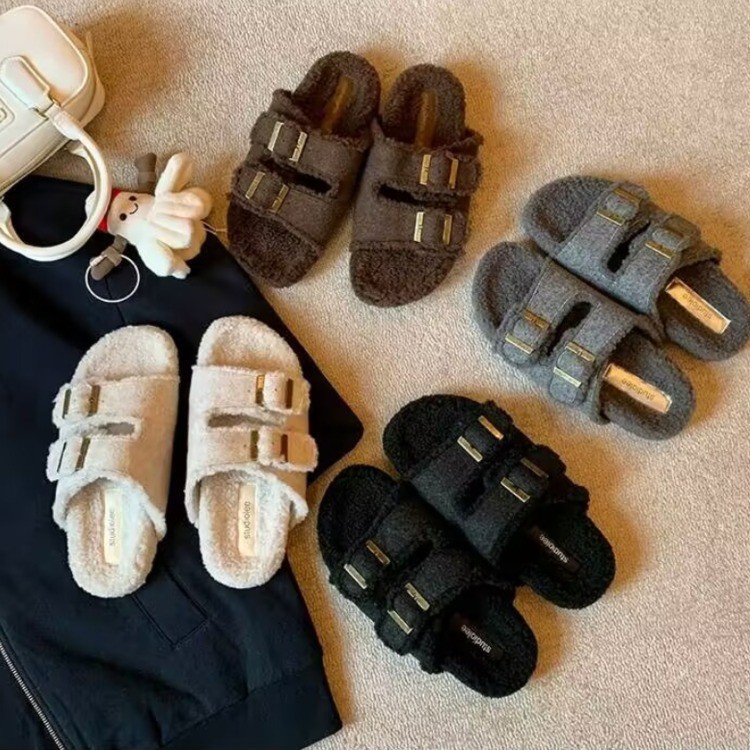 2025新款超火经典厚底毛毛勃肯拖鞋女秋冬新款双排扣懒人外穿拖鞋