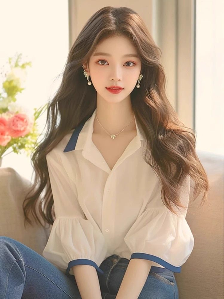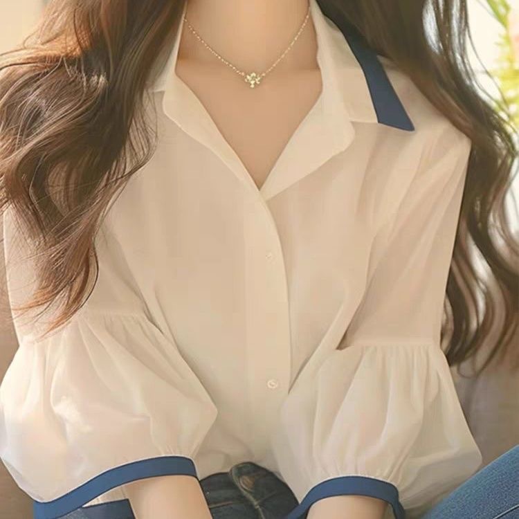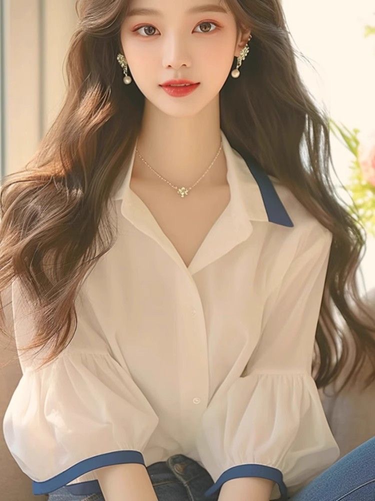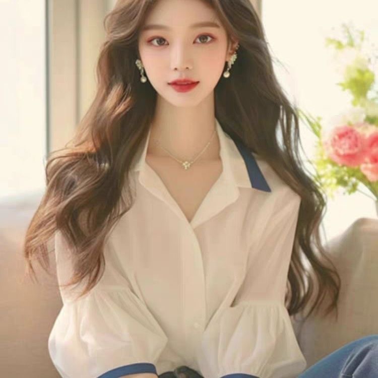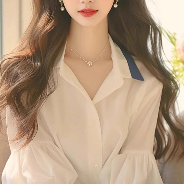 2025春の新しいスタイルの小さなシャツデザインの女性用ブルー花柄シャツ、ハイエンド、軽い贅沢、年齢を軽減する西洋スタイル