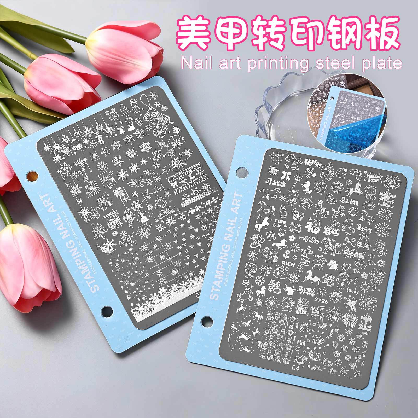 爆款新年美甲印花钢板马年马到成功爱心图案指甲转印模板美甲工具