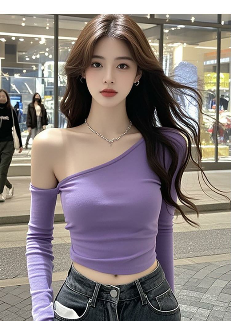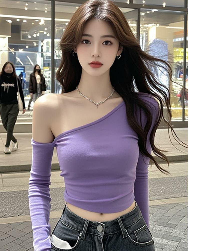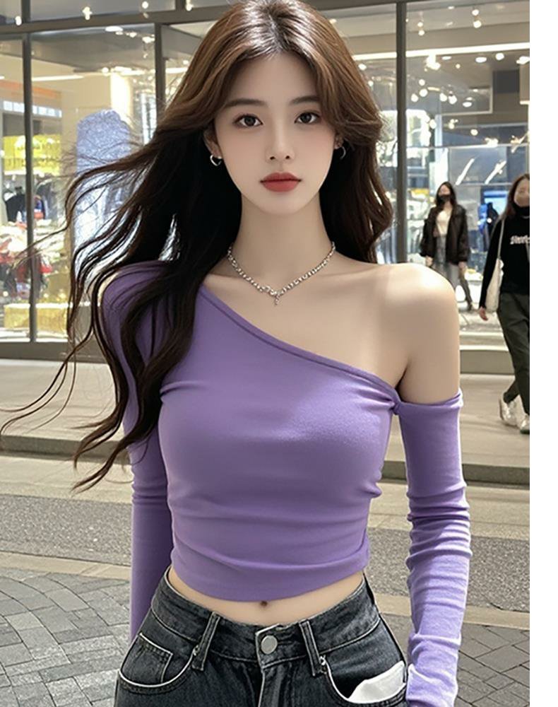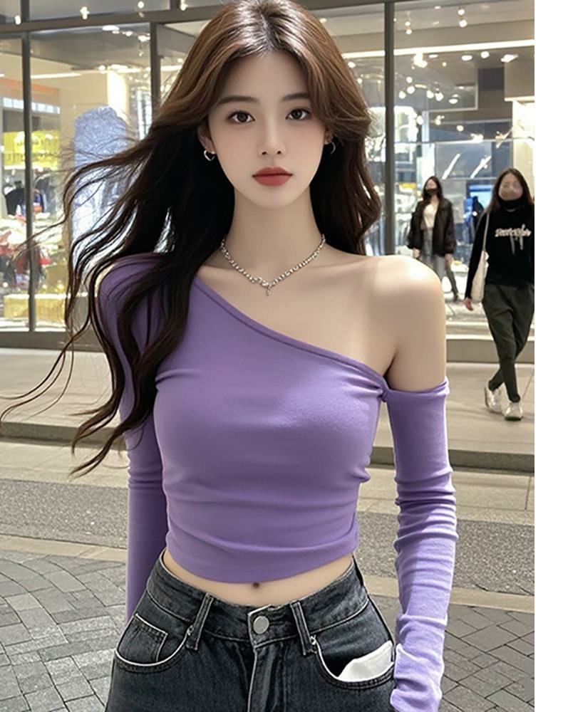 女性用トップス、新しいデザイン、スリムフィット、アメリカンニッチ、ワンショルダー、タトゥー、純粋な欲望、長袖、シックなレター
