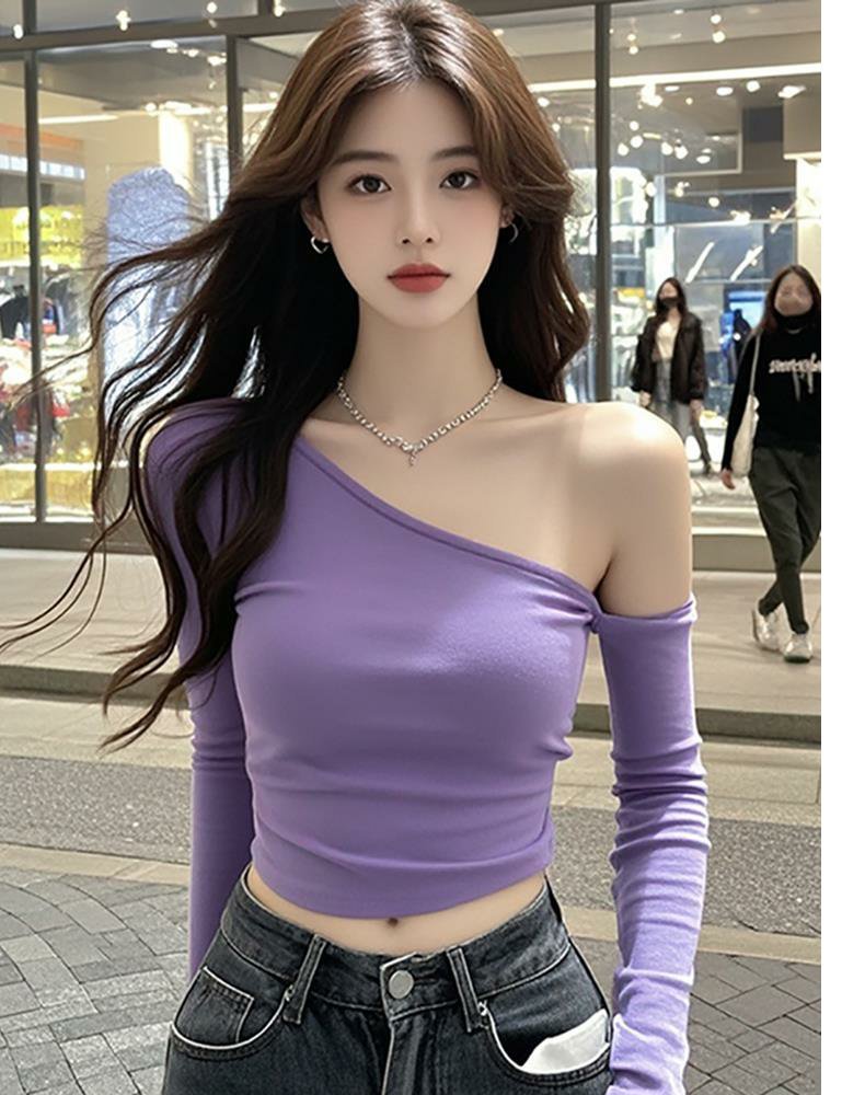 纯色露肩上衣感修身褶皱别致斜肩辣妹长袖T恤女小众秋冬季设计风