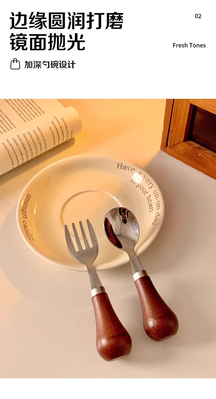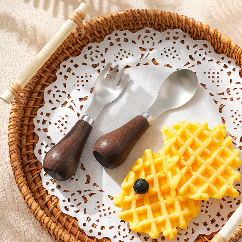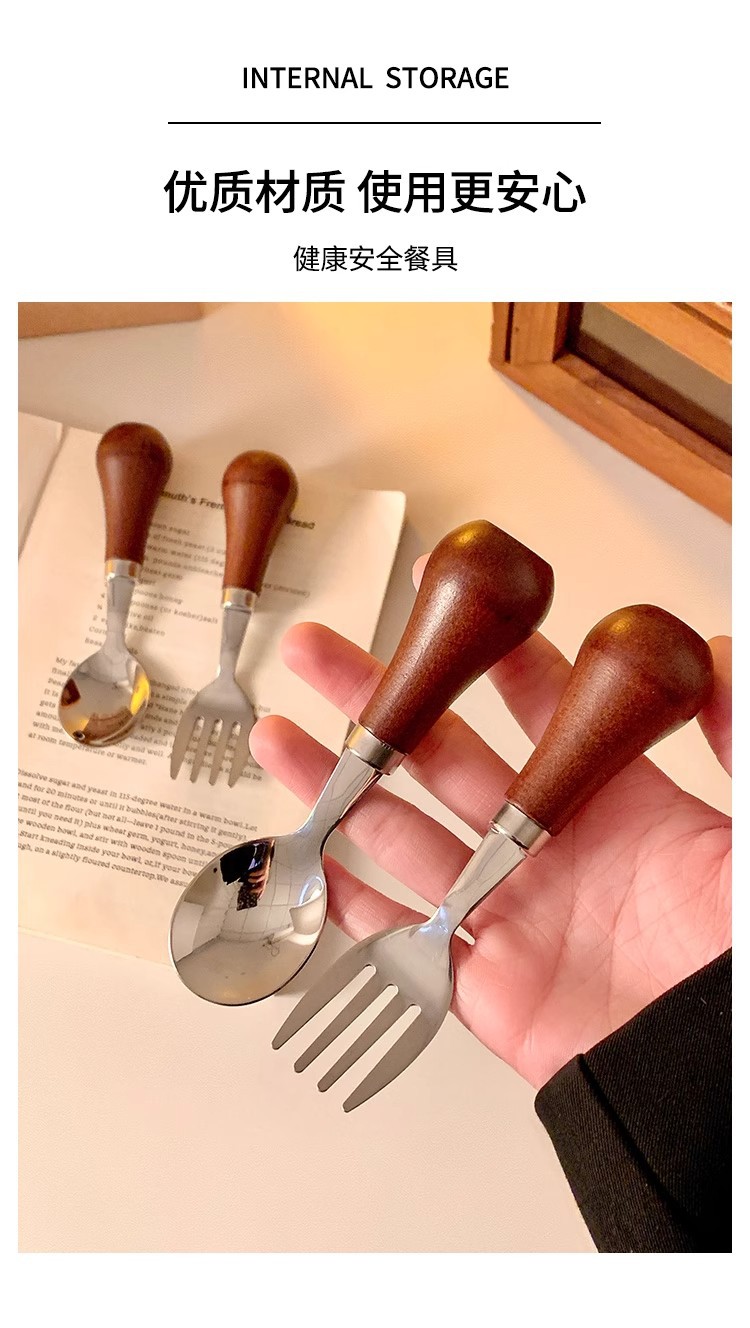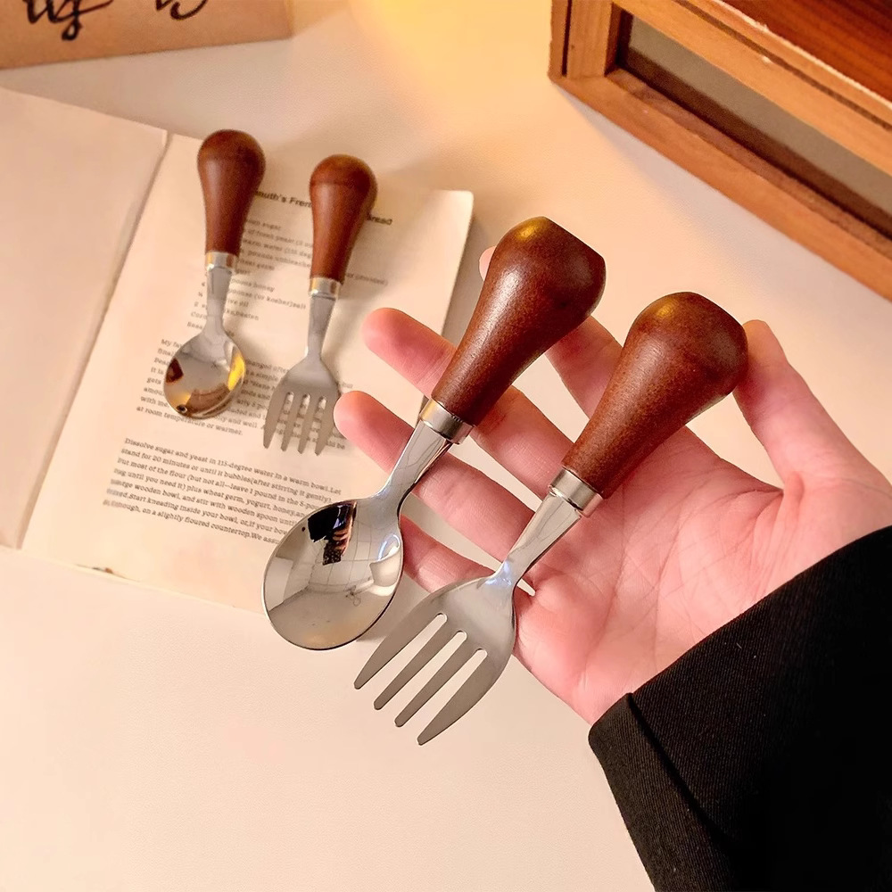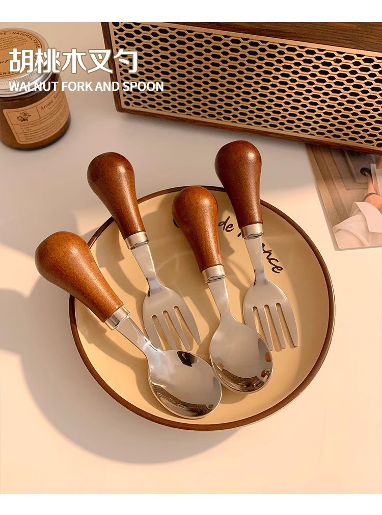 胡桃木304ステンレスフォークスプーンセット食器大人子供用デザートスプーンスイカフォーク立ちスプーン