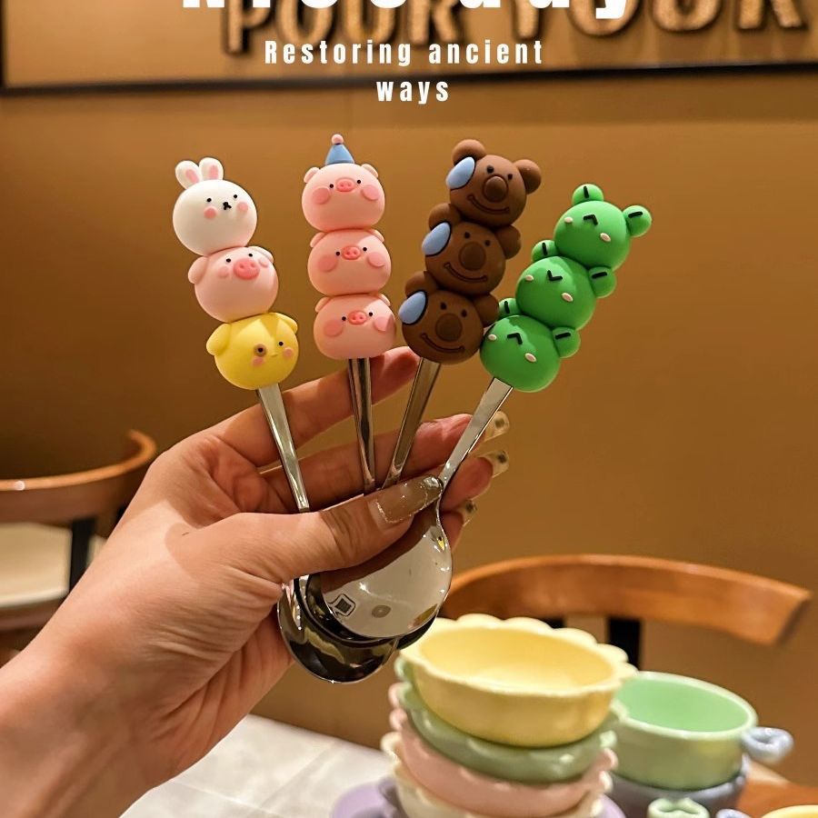 クリスマス食器セットドーパミンカラー衝突色小動物漫画転倒防止デザートスプーン果物フォークステンレススプーン