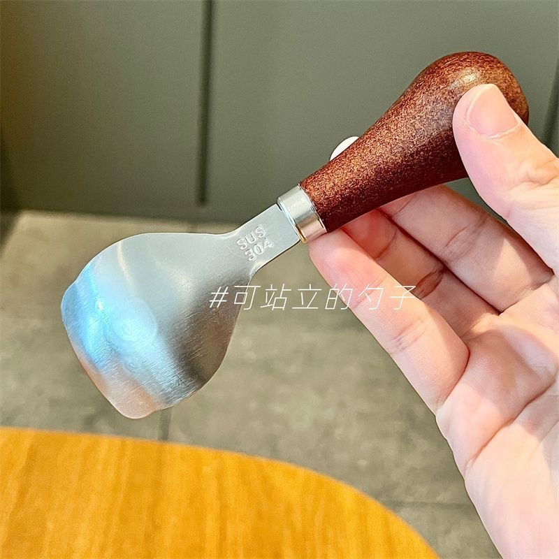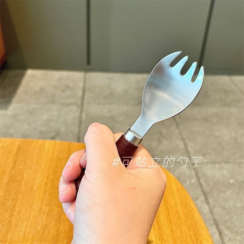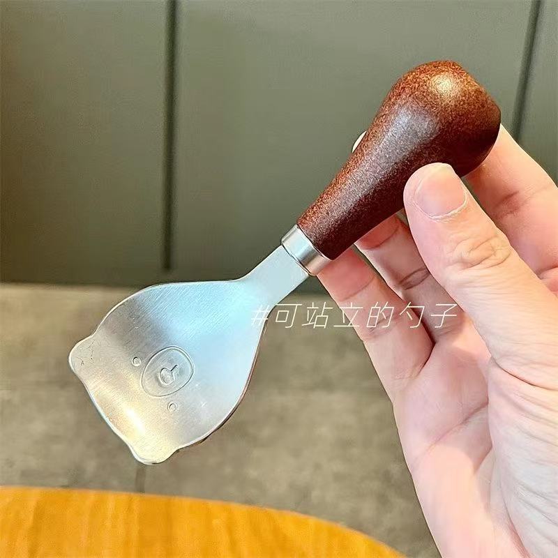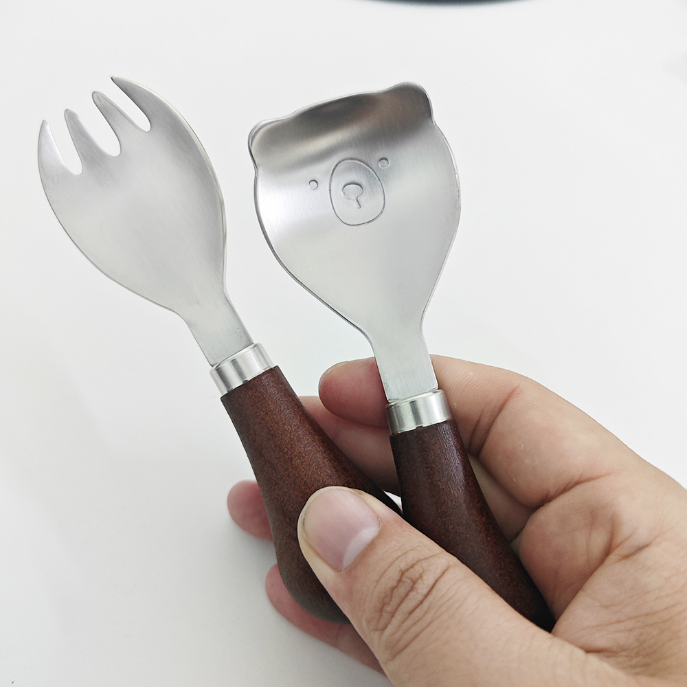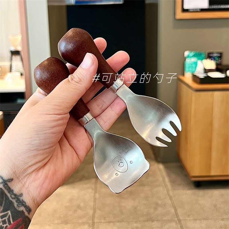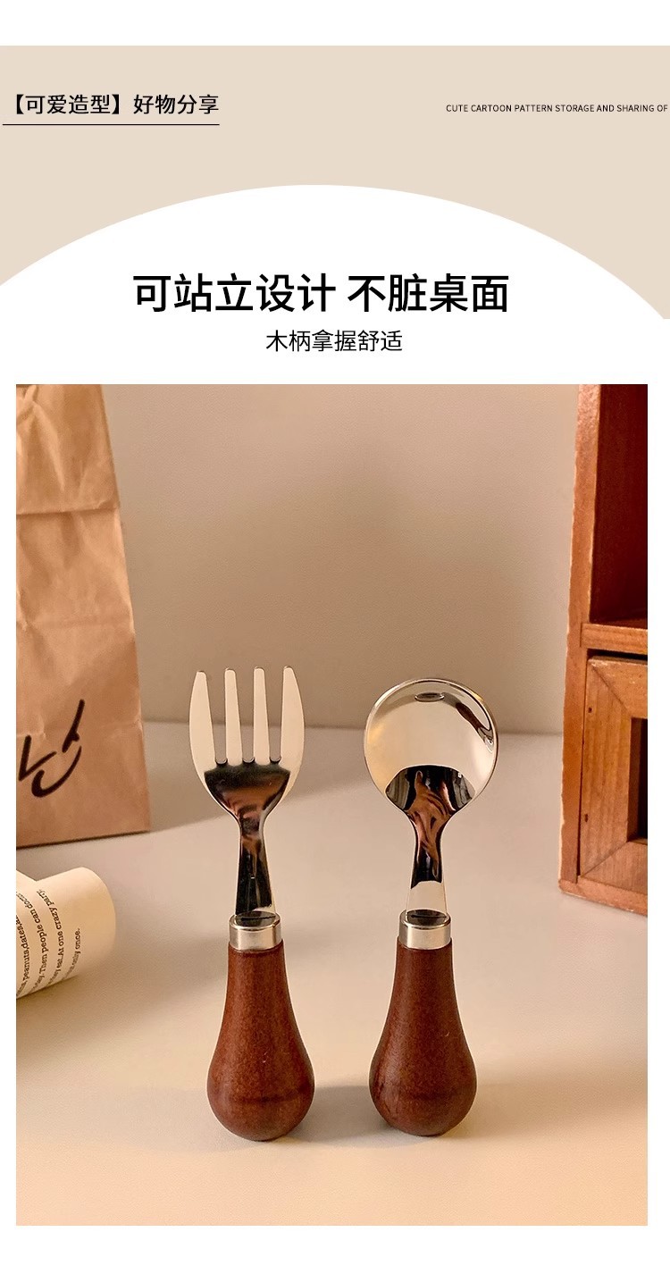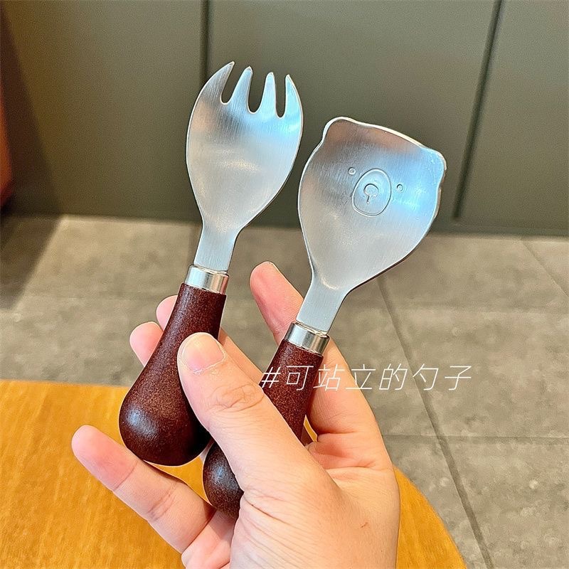 食品级304不锈钢可站立体儿童勺叉可爱木柄小熊勺子汤勺调羹ins风