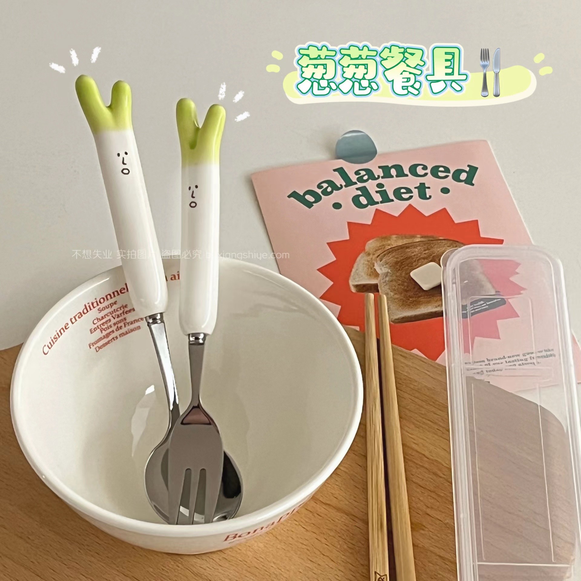 かわいいネギ創意ステンレススプーンフォーク箸insアニメ三点セット食器家庭用食事スプーン