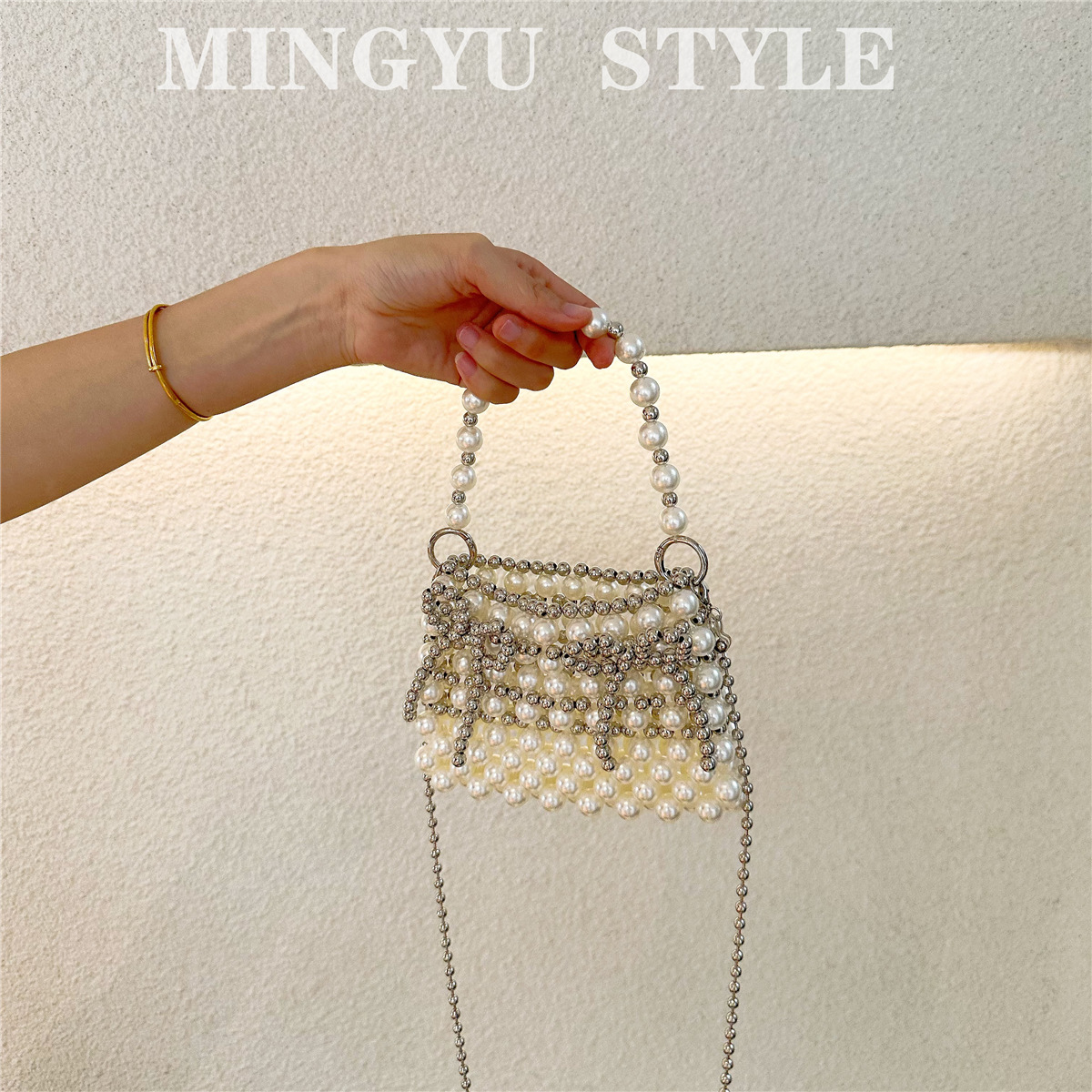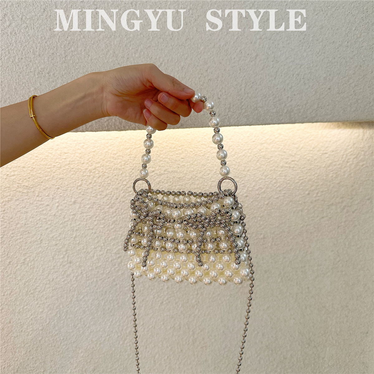 韓系数珠小衆デザイン透かし彫りバッグ蝶結びレディース気質ハンドバッグ高級感シングルショルダーバッグ