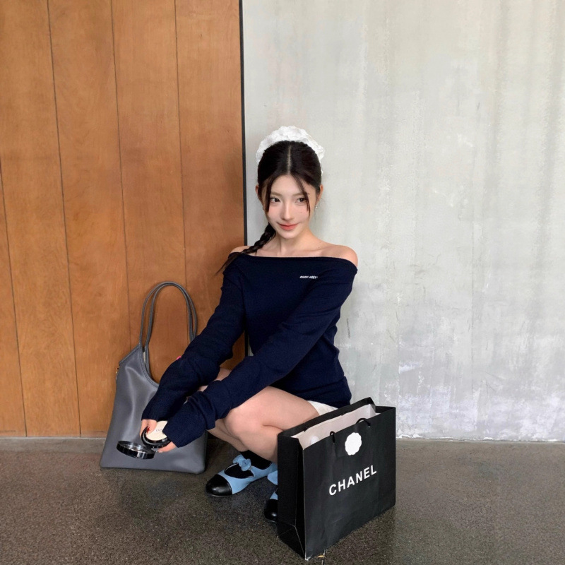 mm家25ss秋冬新款藏青色针织衫一字肩也可抹胸也可斜肩穿多穿法