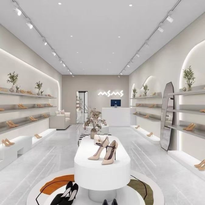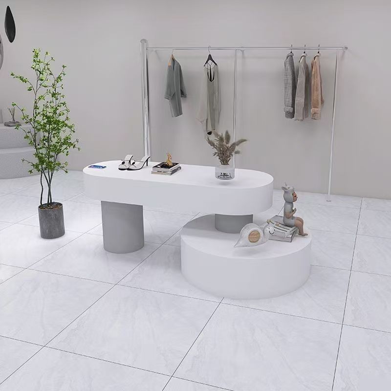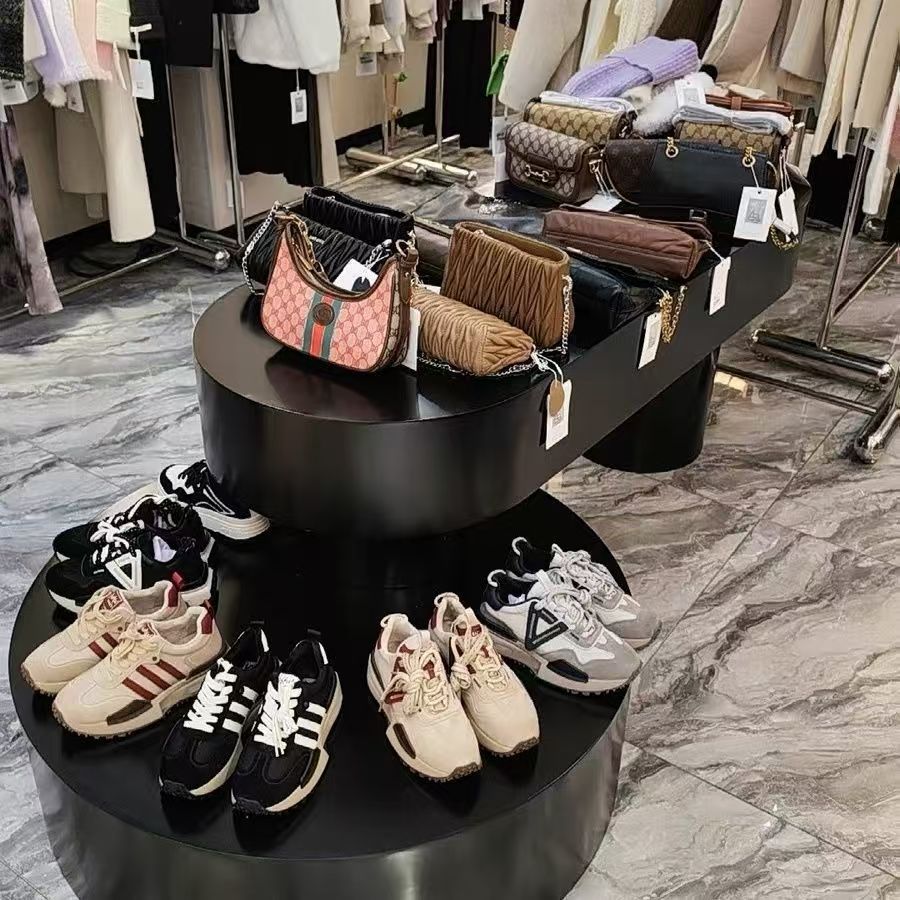 婦人服店の流水テーブル、アイランドディスプレイテーブル、テーブルの中央に置かれたシーン装飾靴とバッグのディスプレイラック