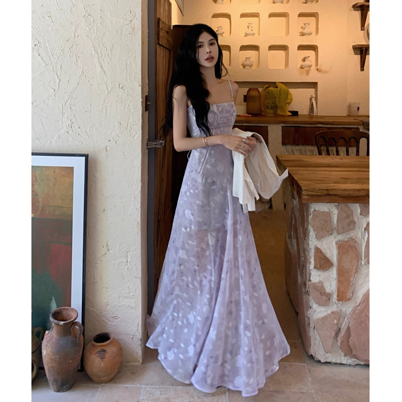 フランスの優しい気質の紫色の花のストラップのワンピースの海辺の休暇の美しい独特なウエストのa字の長いスカート