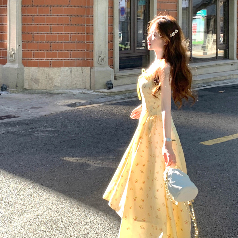 フランスの黄色の花のスカートの小さい背のサスペンダーのワンピースの女性の夏の新型の雰囲気の通勤する気質の長いスカート