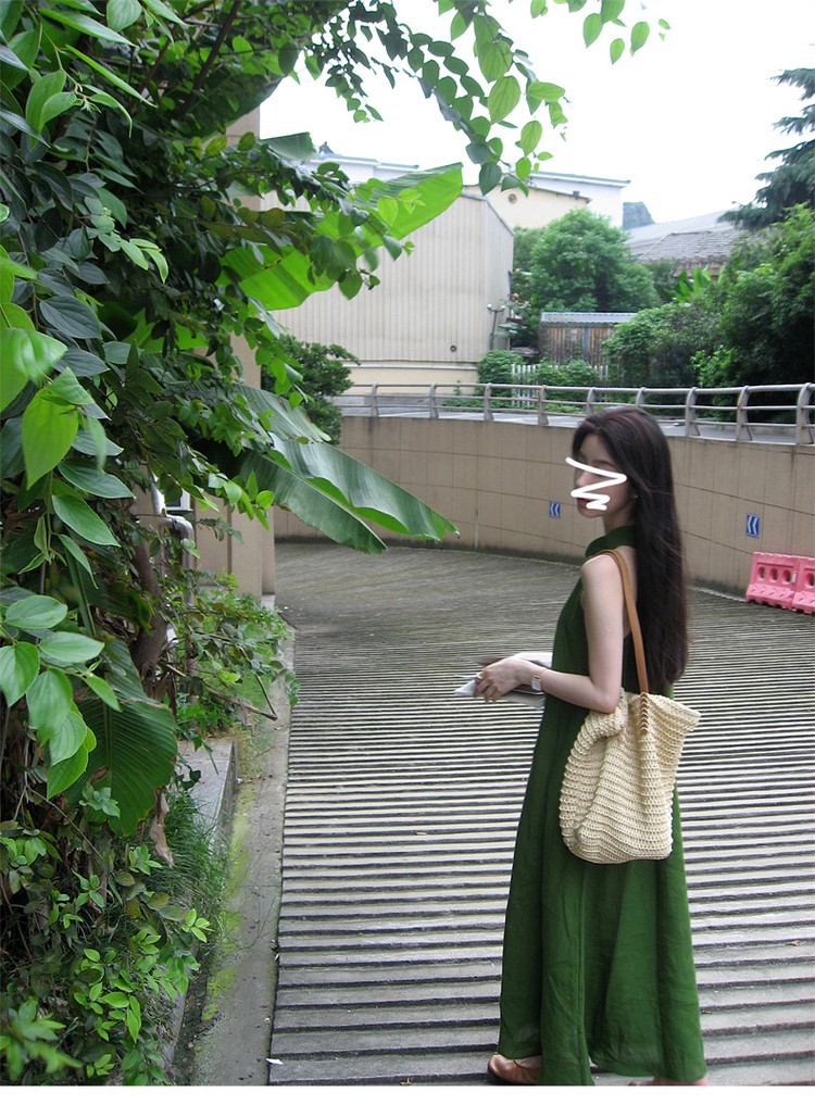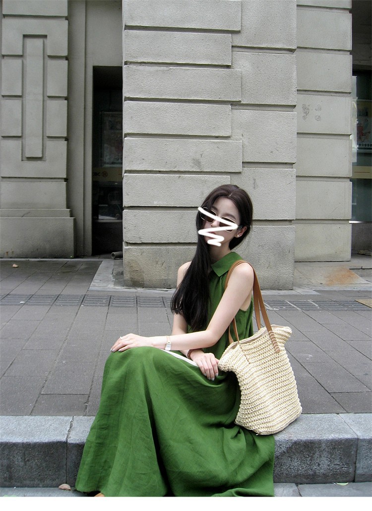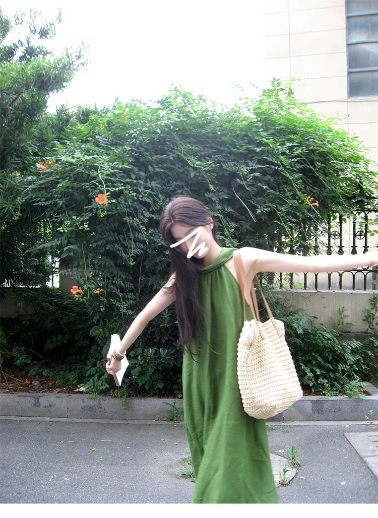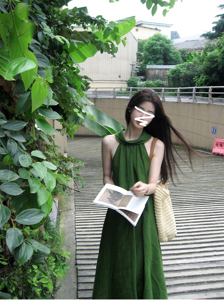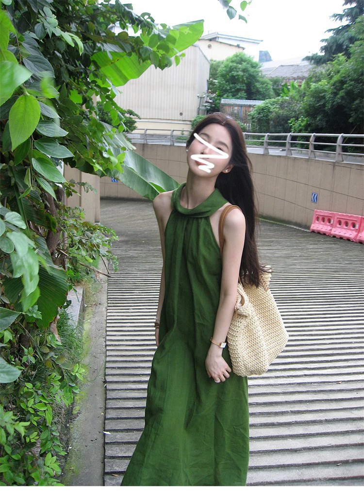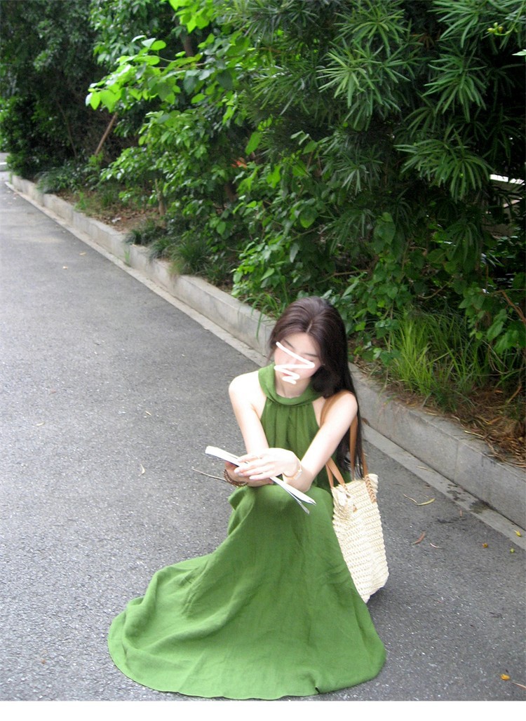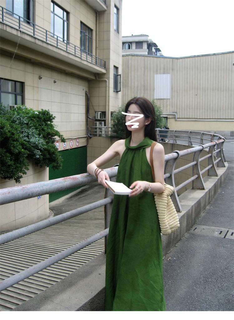 フランスの高級感のある緑の首のサスペンダーのワンピースの子供の夏の2025新型の海辺の休暇の気質のロングスカート