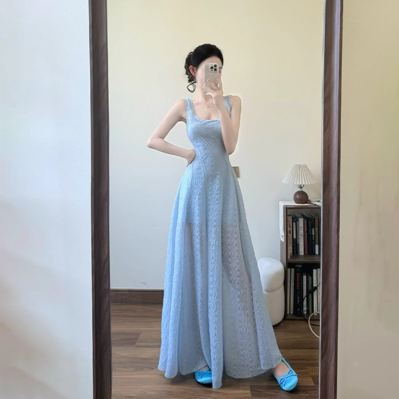 フレンチピュアデザイアビーチバケーションブルーサスペンダードレスレディースデザインウエストノースリーブベストロングスカート夏