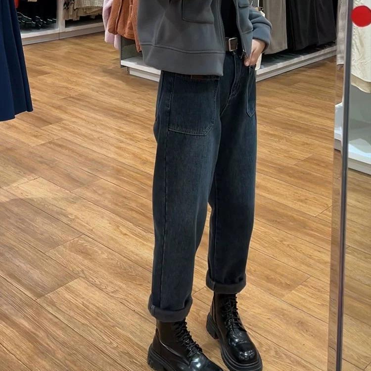 ブルーグレーのストレートジーンズの女性は冬に大きなサイズの梨の形をして太ったmmがゆったりして痩せている