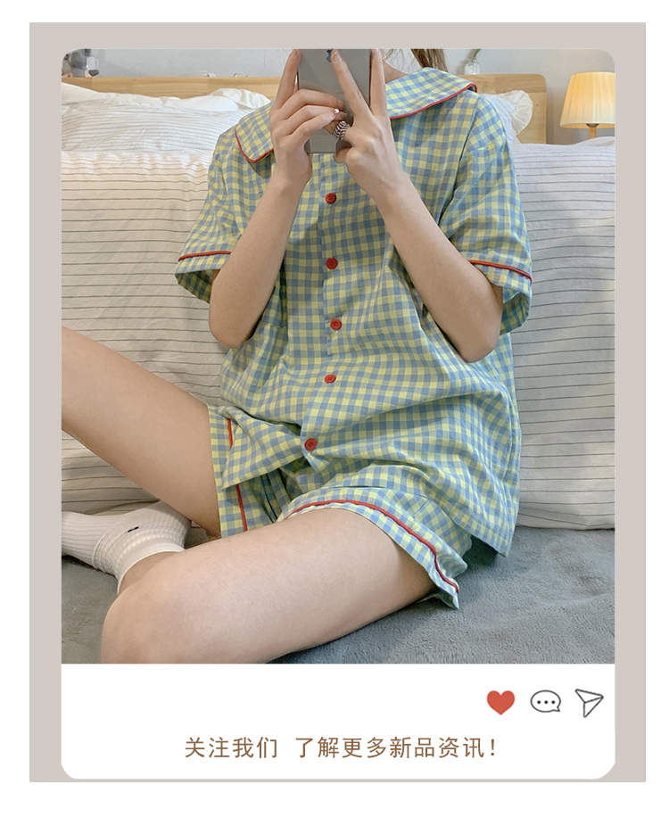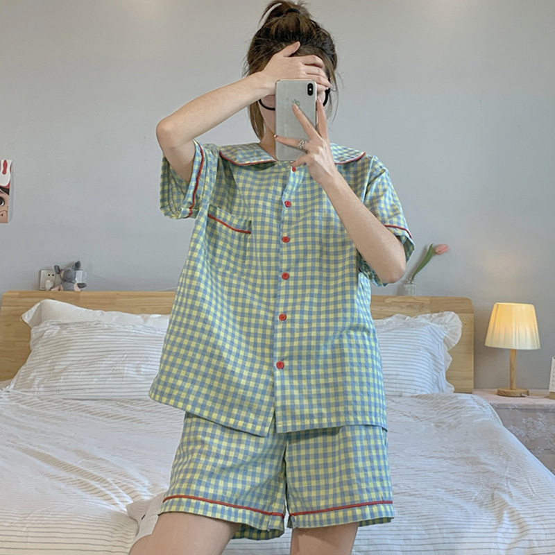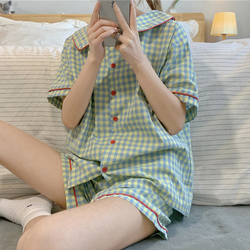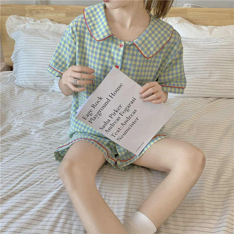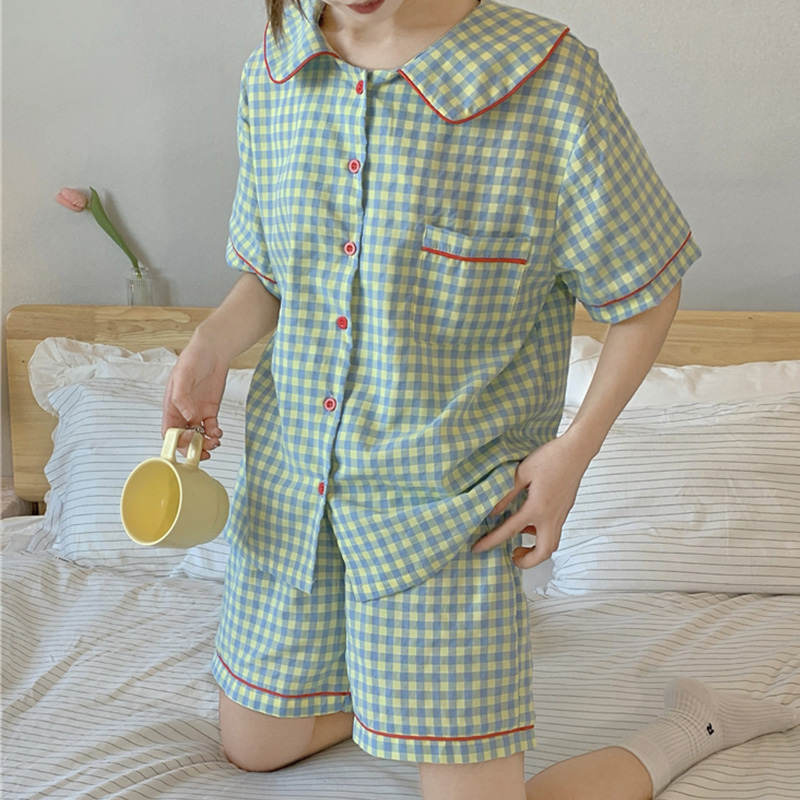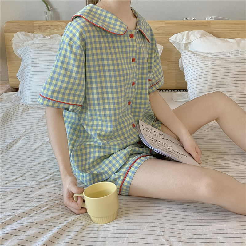 日本のチェック柄パジャマ女性の夏の半袖ショーツ小柄な薄い学生ツーピース綿カジュアルホーム服