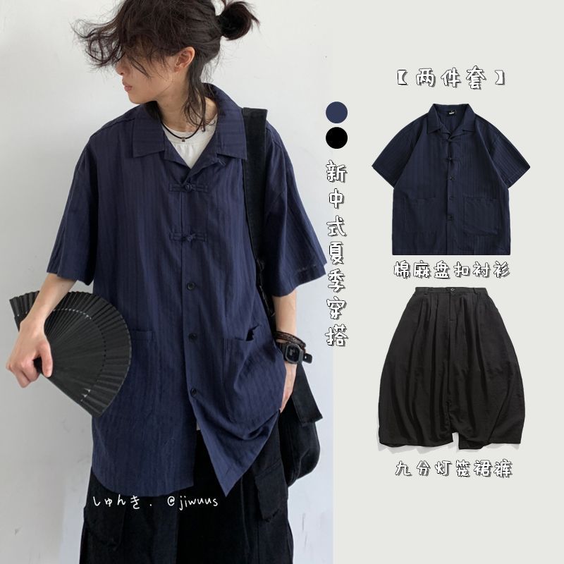 夏の新しい中国風の衣装、ネイビーブルーの半袖コットンとリネンのボタンダウンシャツの完全なセット、男性と女性の大学生のためのレトロなシャツ