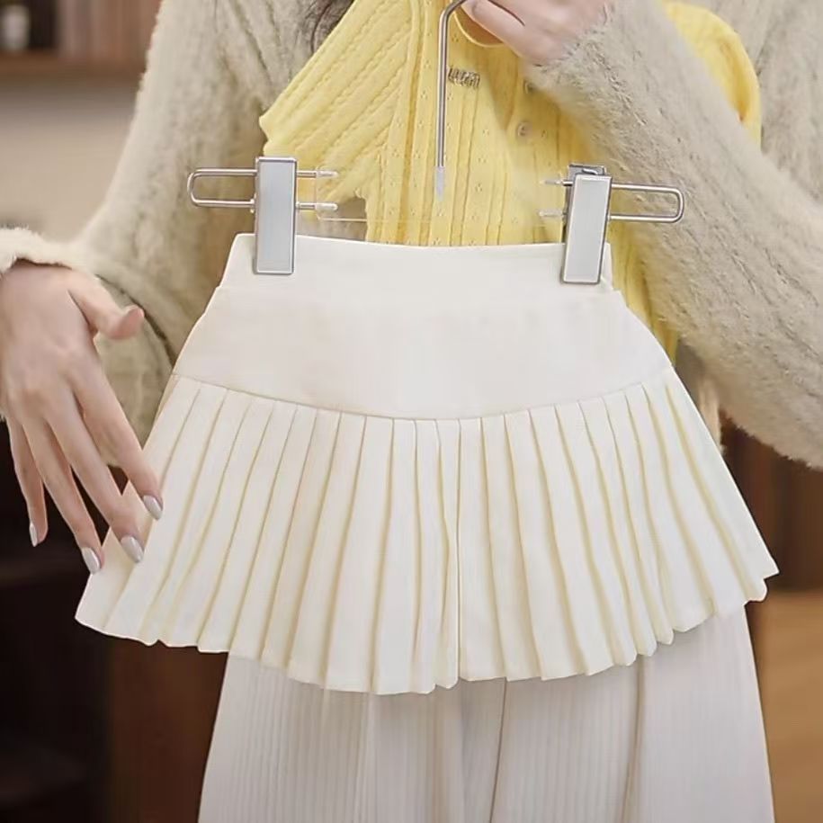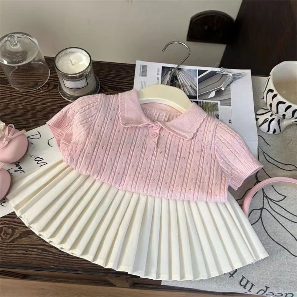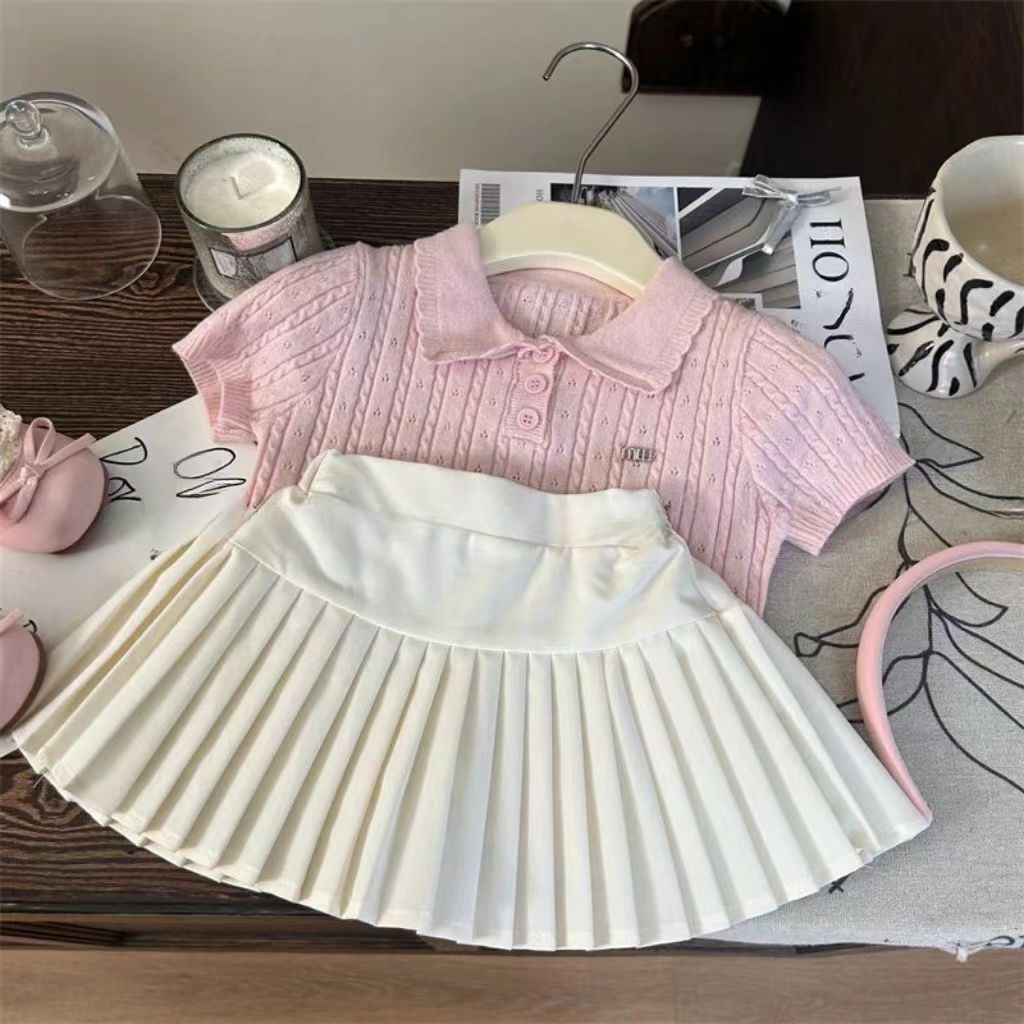 ピンクのニット半袖+白のプリーツスカート,ピンクのニット半袖,白プリーツスカート【安全パンツ付き】