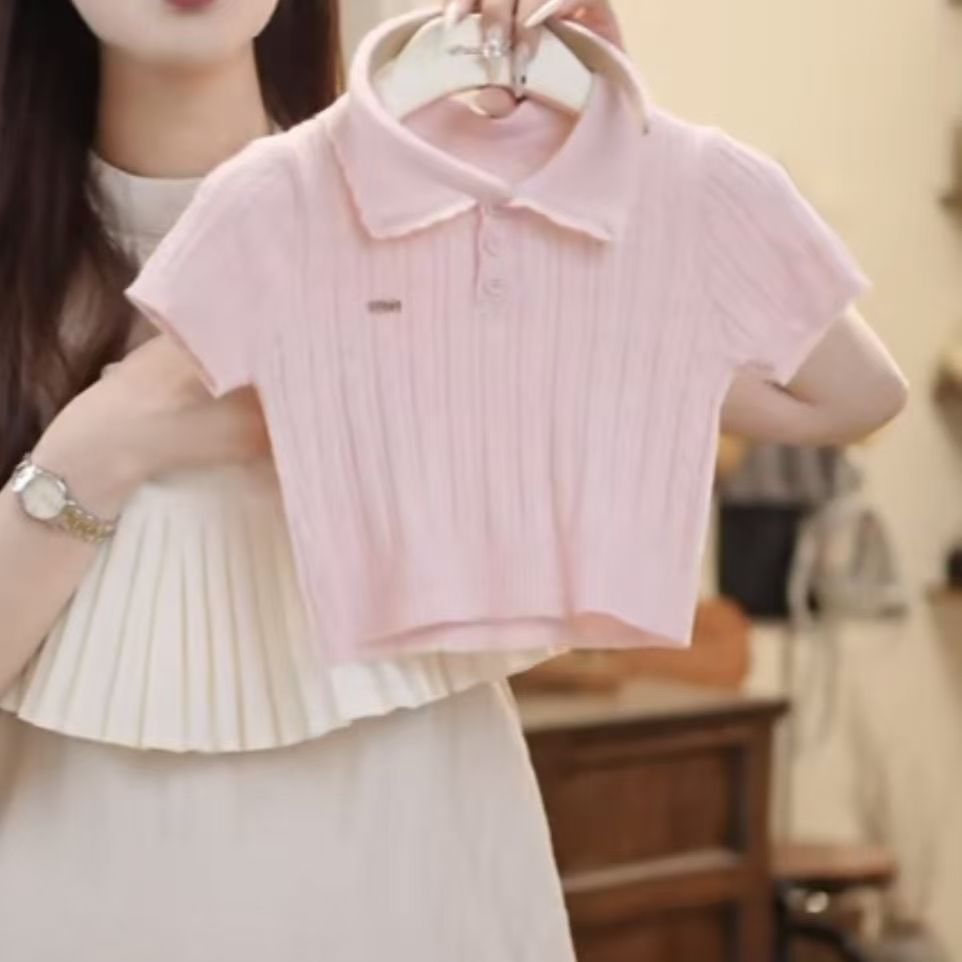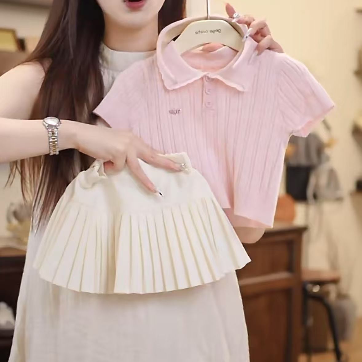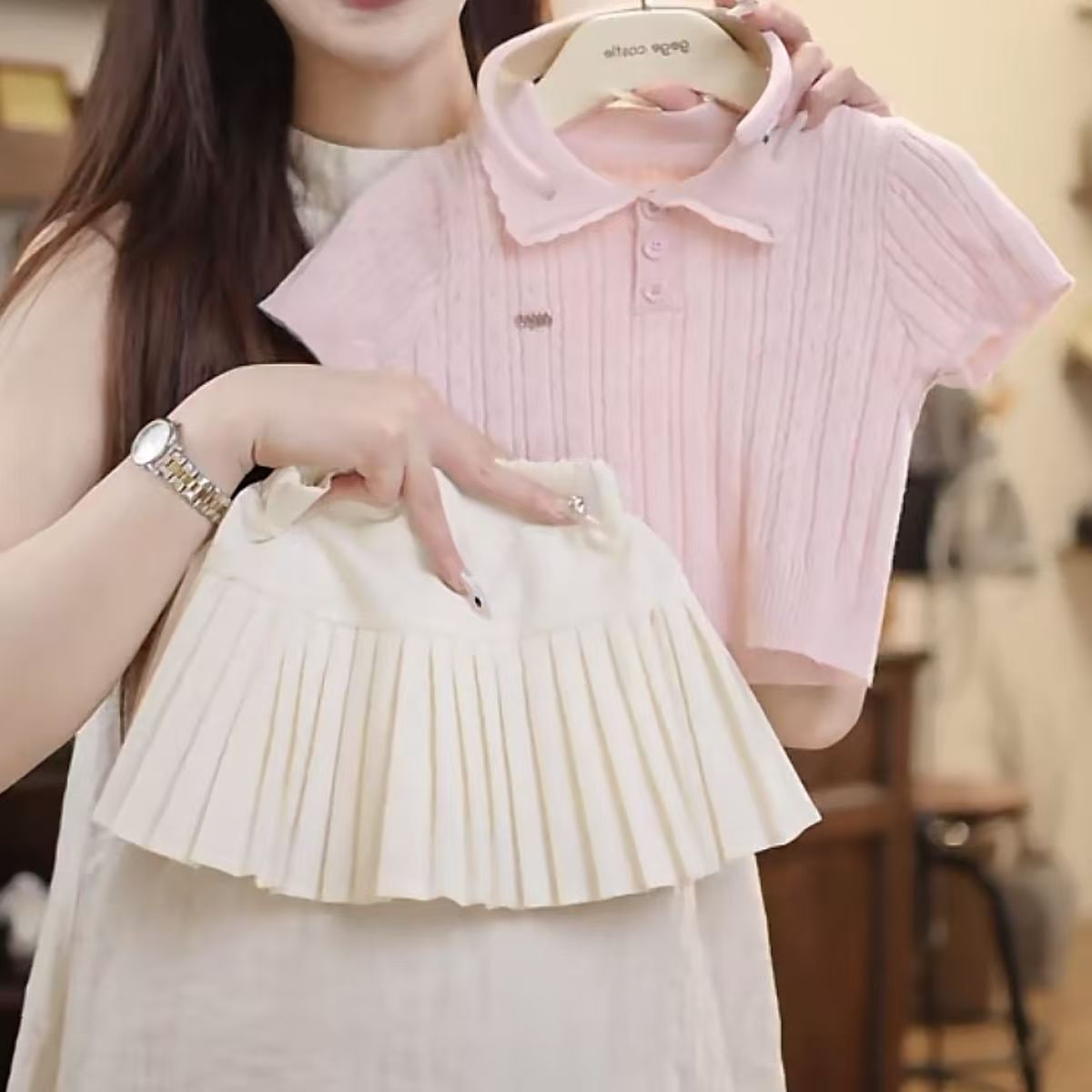 ピンクのニット半袖+白のプリーツスカート,ピンクのニット半袖,白プリーツスカート【安全パンツ付き】