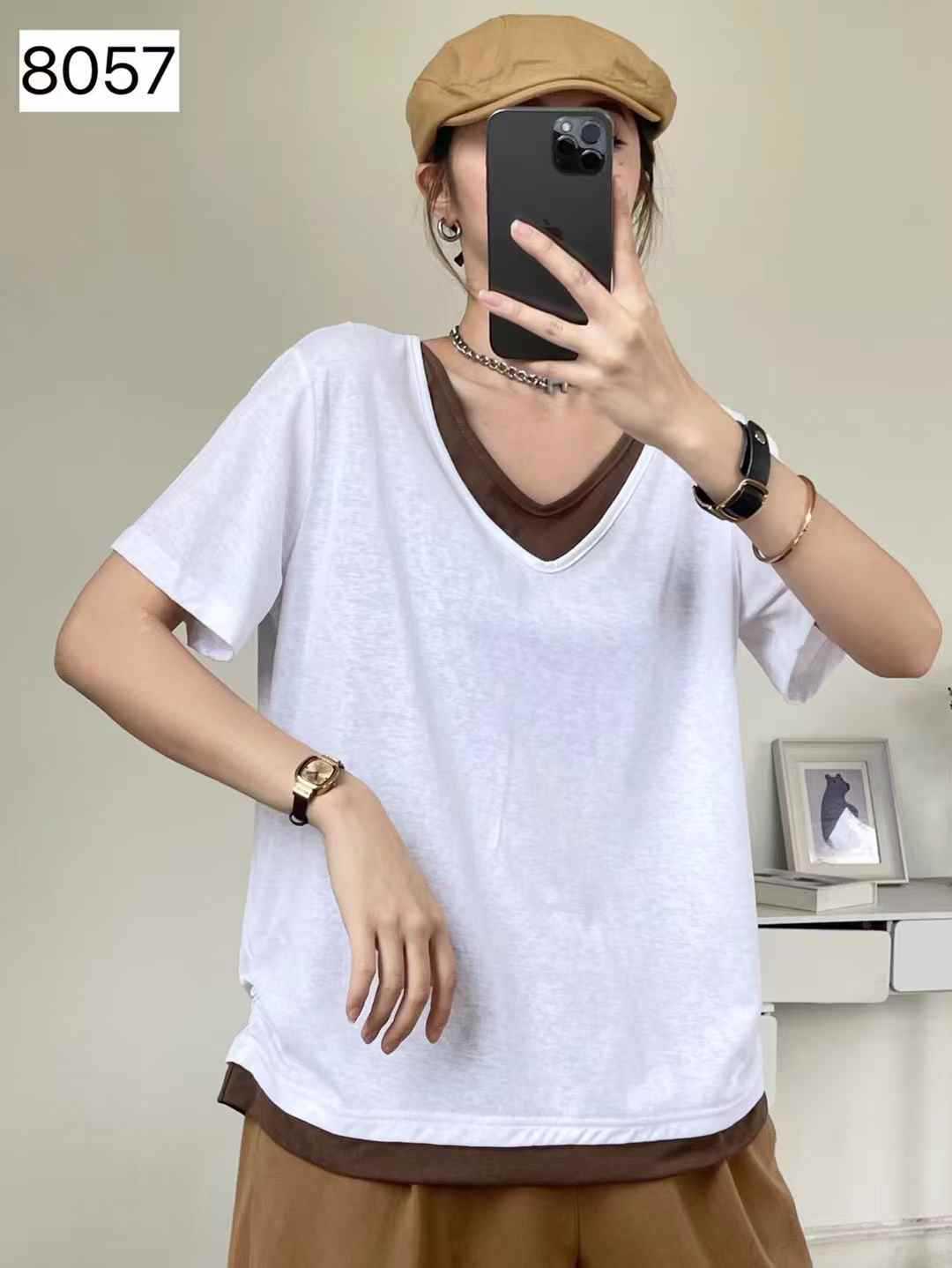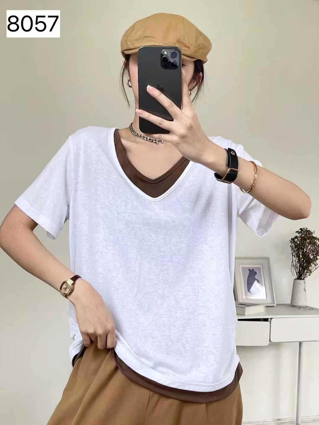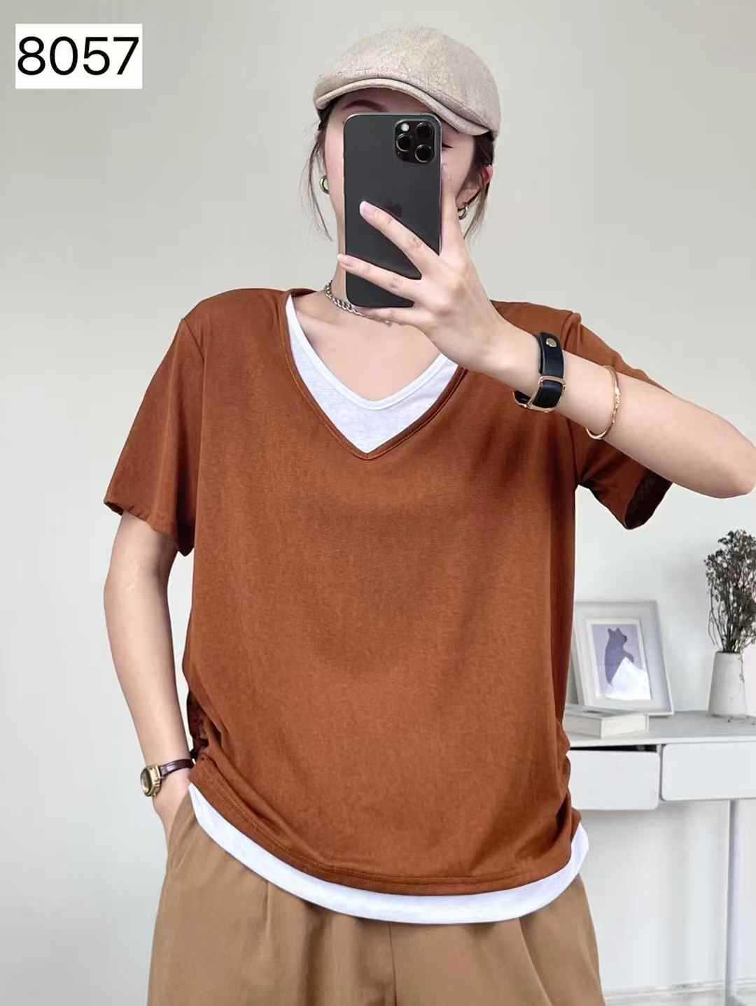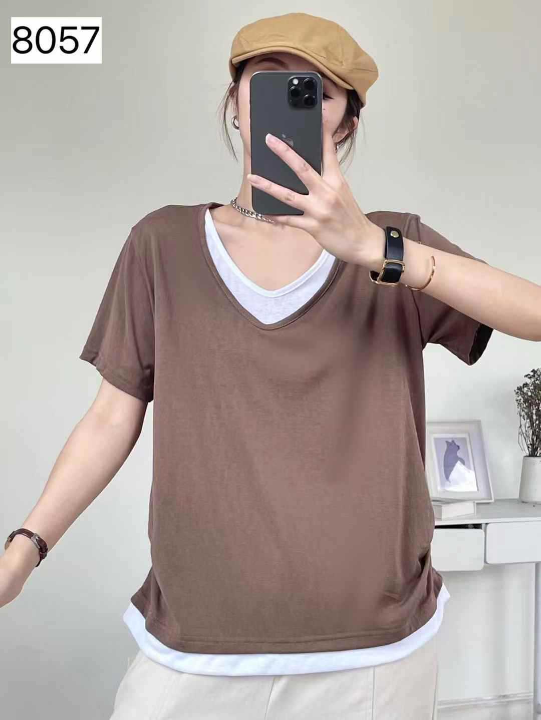 yl8057 偽ツーピース V ネック半袖 Tシャツ女性の夏のルーズ痩身薄いお腹カバー半袖 Tシャツトップ新しい