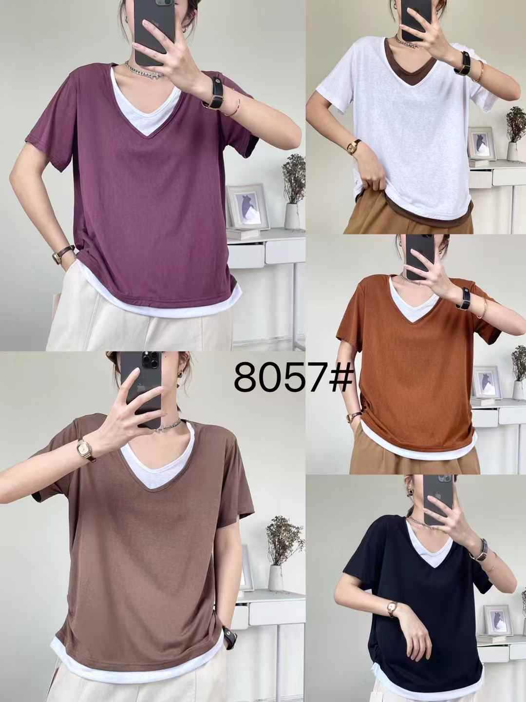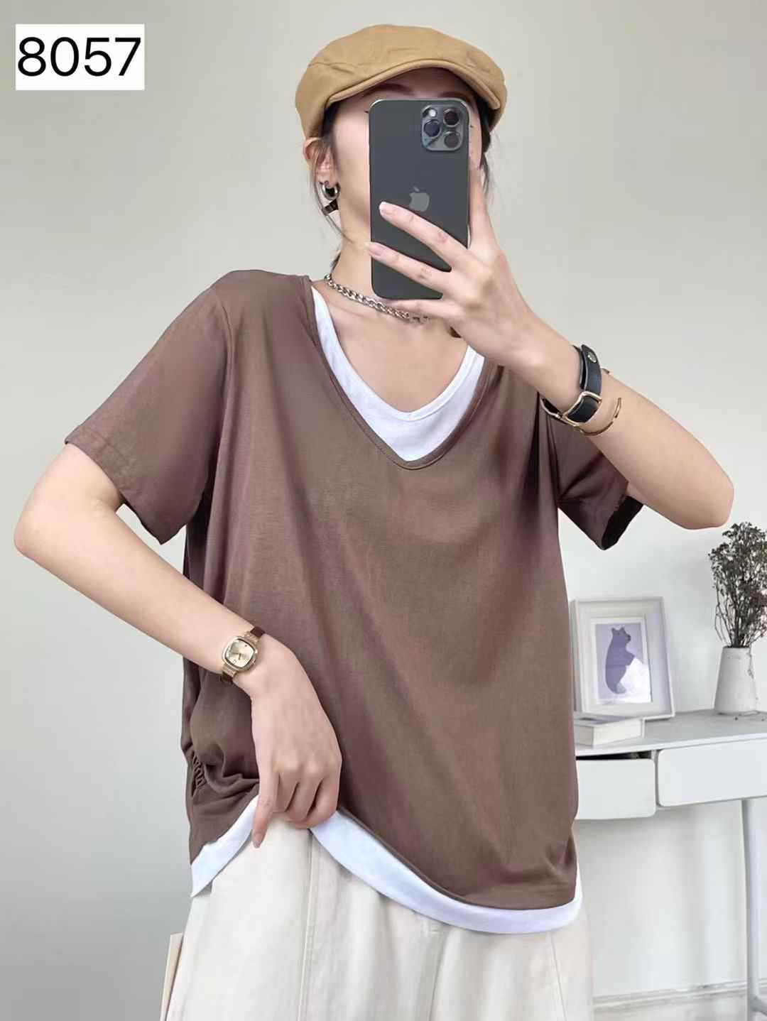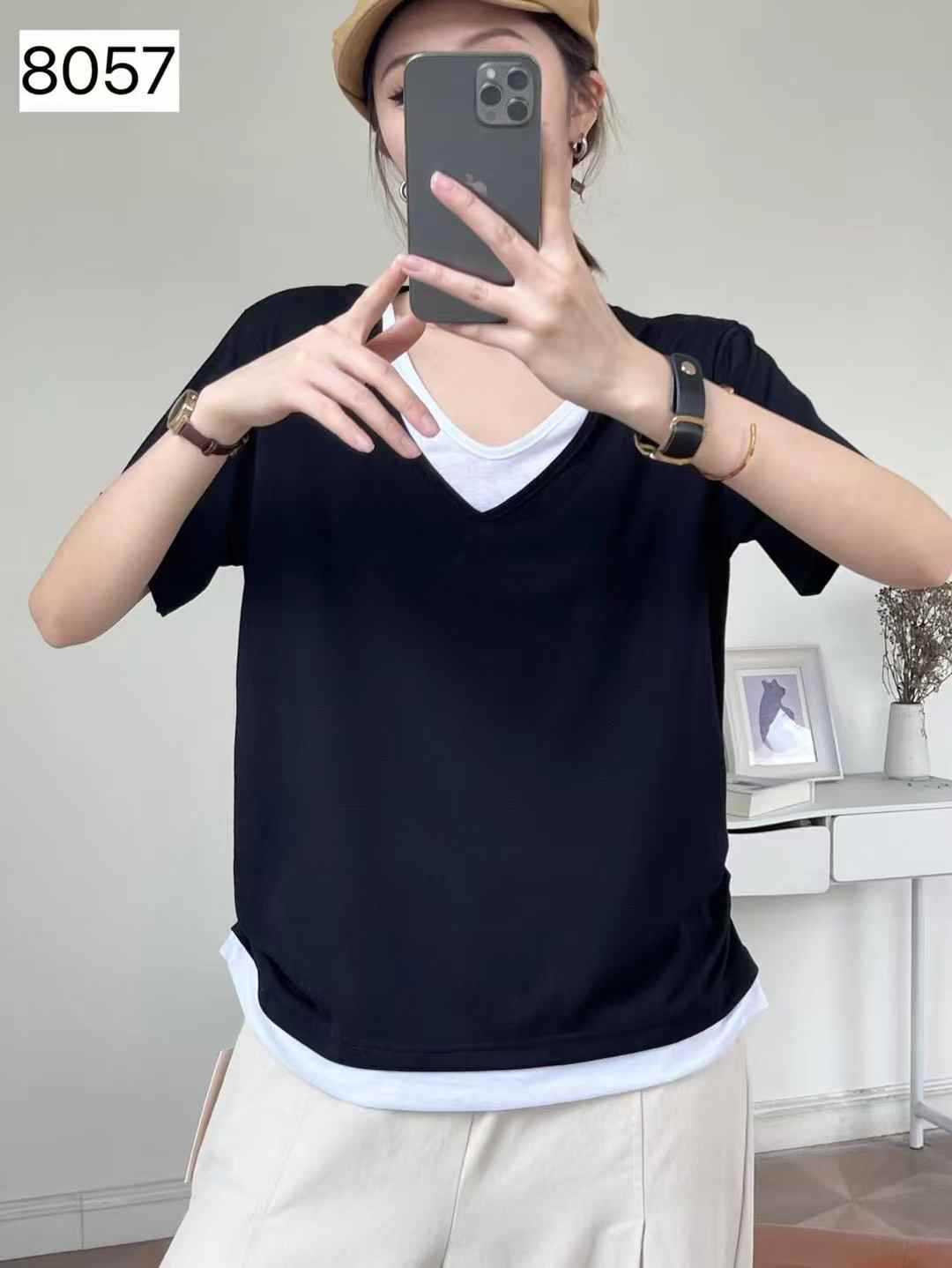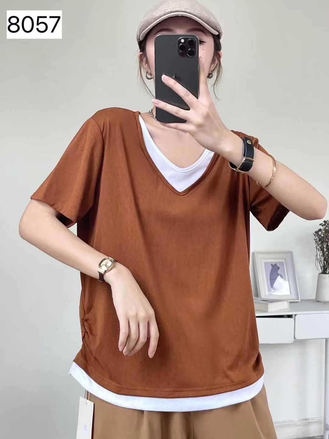yl8057 偽ツーピース V ネック半袖 Tシャツ女性の夏のルーズ痩身薄いお腹カバー半袖 Tシャツトップ新しい