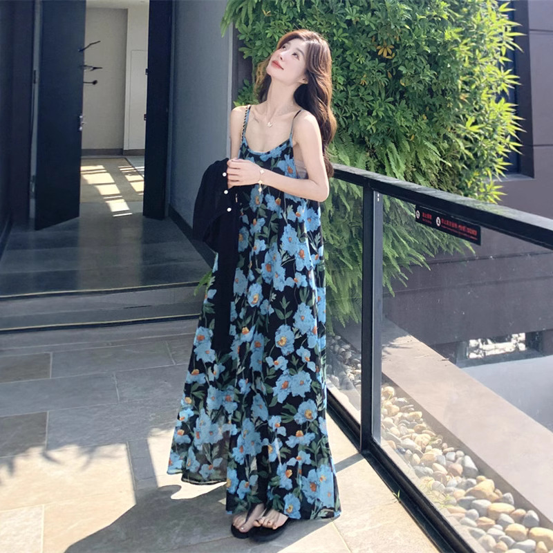 2025新型フランス海辺休暇ロングスカート質感感ブルー色柄ノースリーブストラップワンピース女夏
