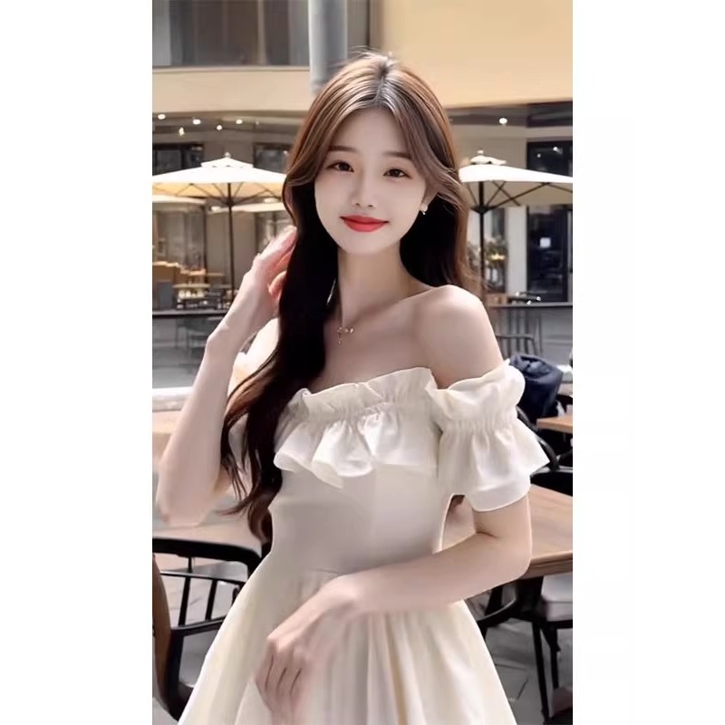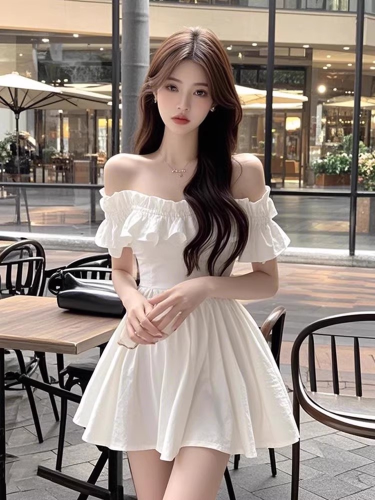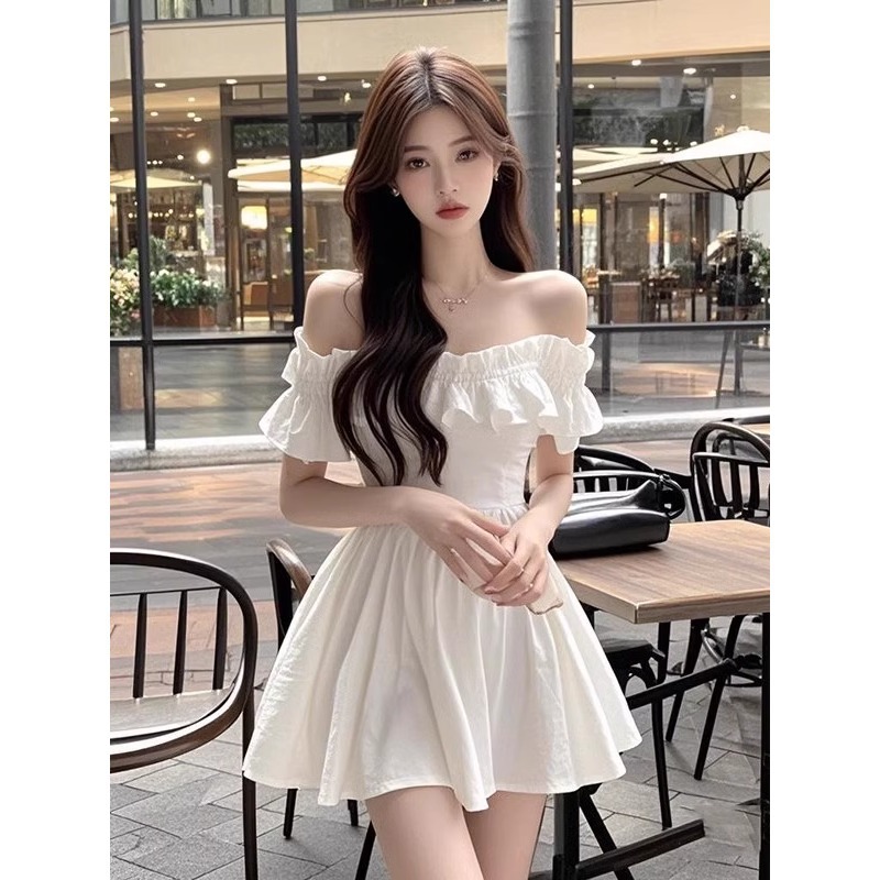 茶休フランス初恋純欲白一字肩半袖ワンピース女性夏新作木耳元a字スカート