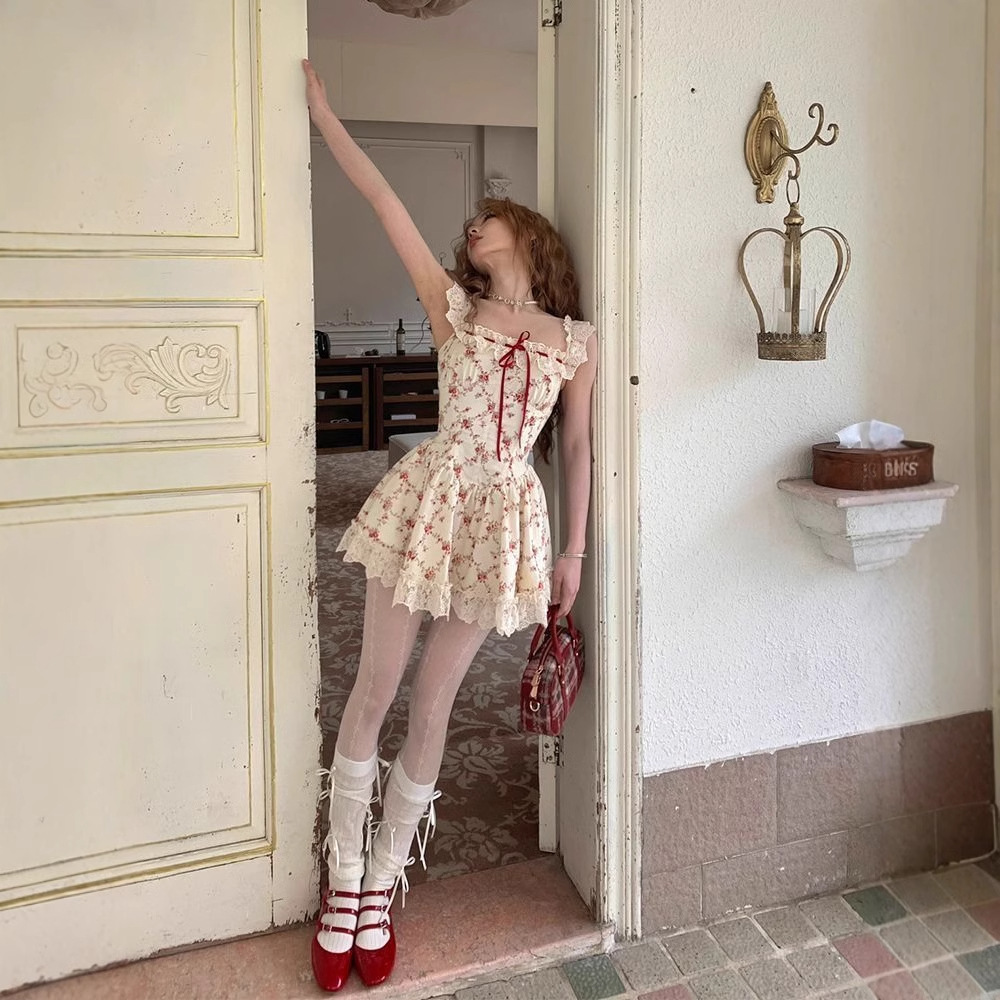 2025年夏の新型フランス気質ファッションロマンチックな蝶結びの小柄な花の短いストラップワンピース