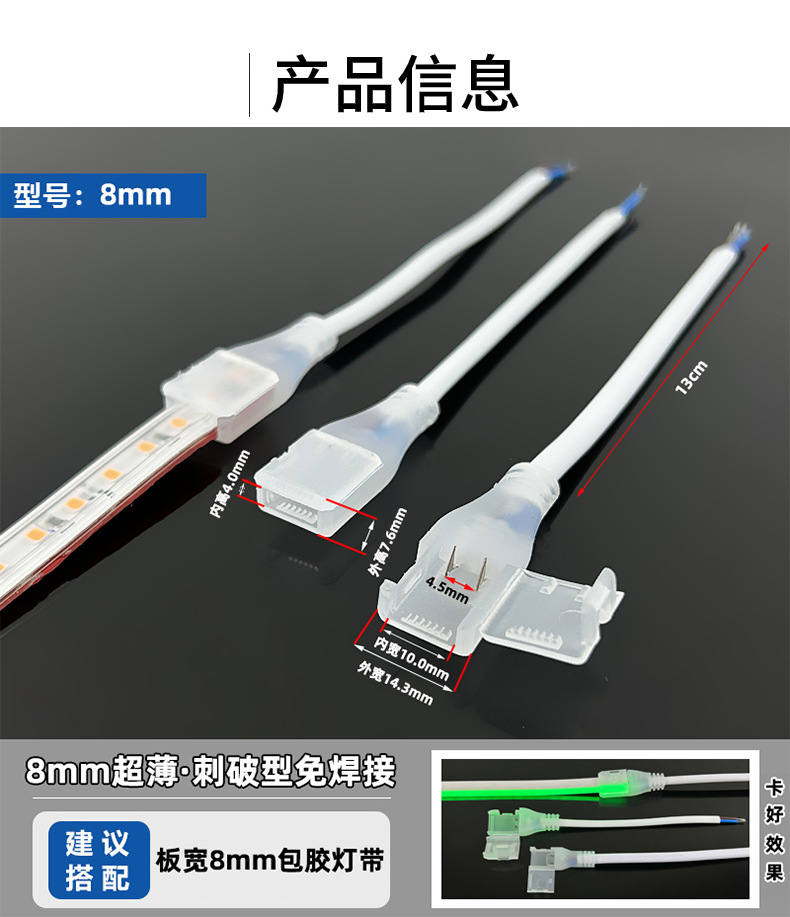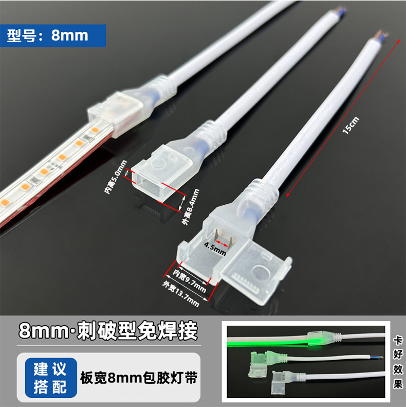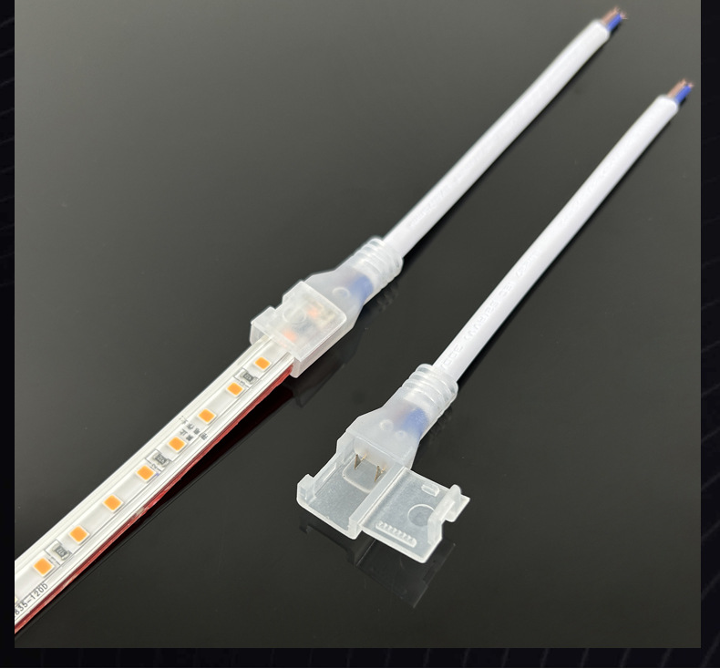 LEDライトストリップは、はんだ付け不要の接続部品です。8mm裸基板、低電圧2ピン高速コネクタ、ランプ用シングルヘッド配線、直角タイプです。