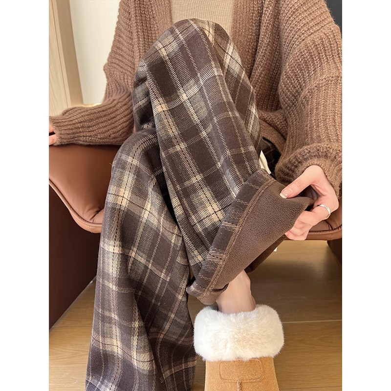 コントラストカラーのレトロな裏起毛チェック柄パンツ レディース 秋冬 ゆったり ルーズ ストレートパンツ ハイウエスト ドレープ感のあるウール素材のワイドパンツ