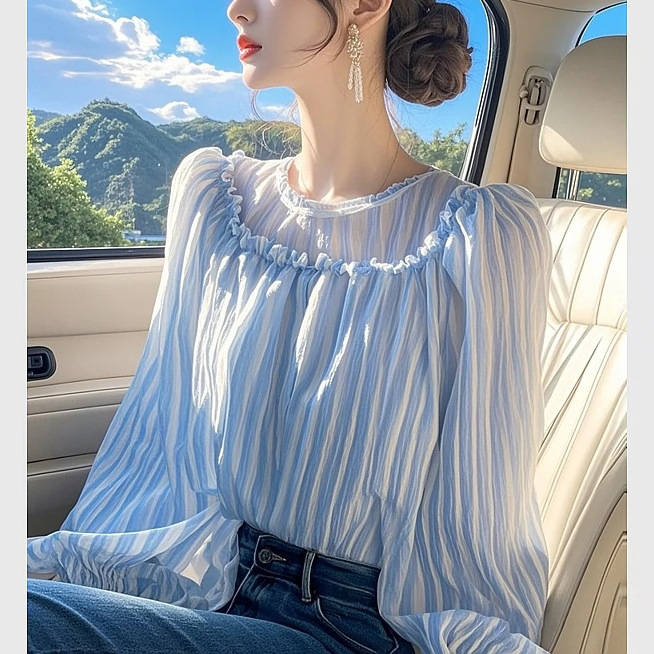 2025早春の洋気減齢超美しい小衆シャツのモコの魚元は青い縦縞の木の耳元の上着を作ります。