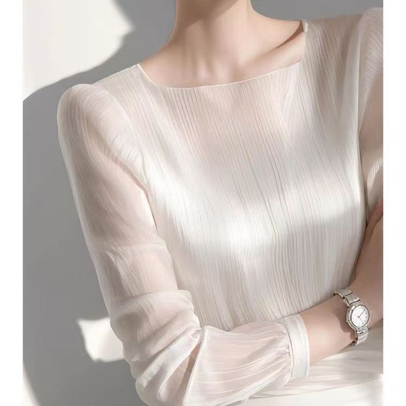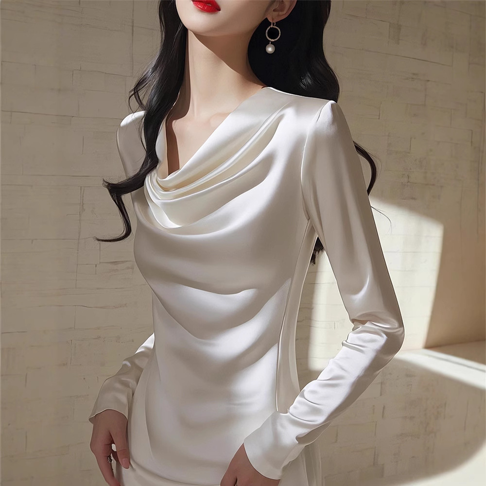 2025春のフランス独特のシックな軽豪華な年齢の洋風の高級感のある酢酸サテンの白い襟のシャツの女性