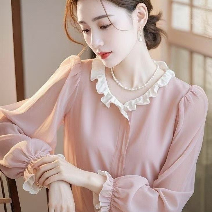 2025早春の新型シンプルなシフォンシャツの灯籠袖の爆発金は絶美で、シフォンの気質の長袖の上着を設けます。