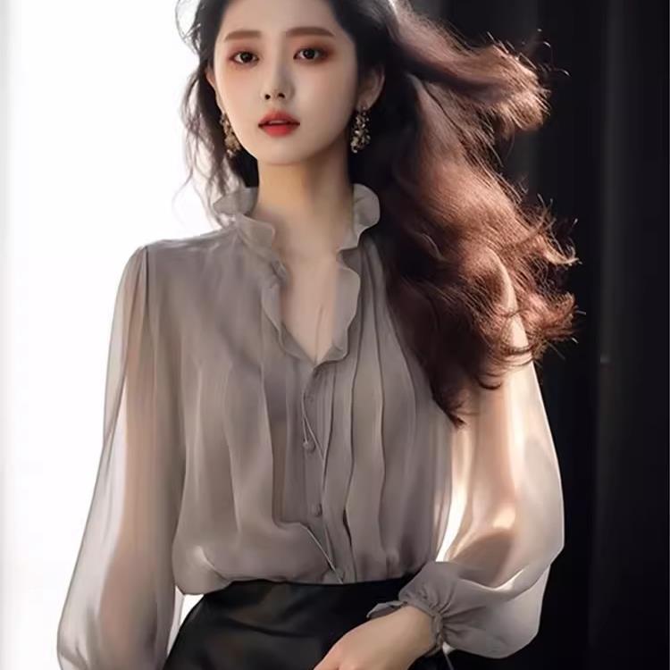 2025年春のフレンチデザインの美しいトップス、とても素敵な外国風の年齢を軽減するグレーのシフォンシャツ