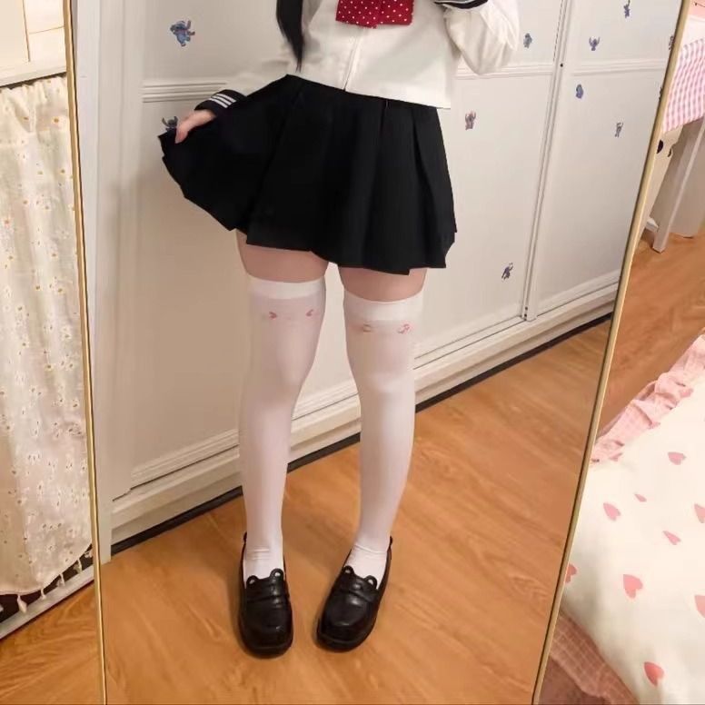 日系长筒过膝袜Lolita甜美吊带袜白色jk大腿袜子yk高筒透黑丝