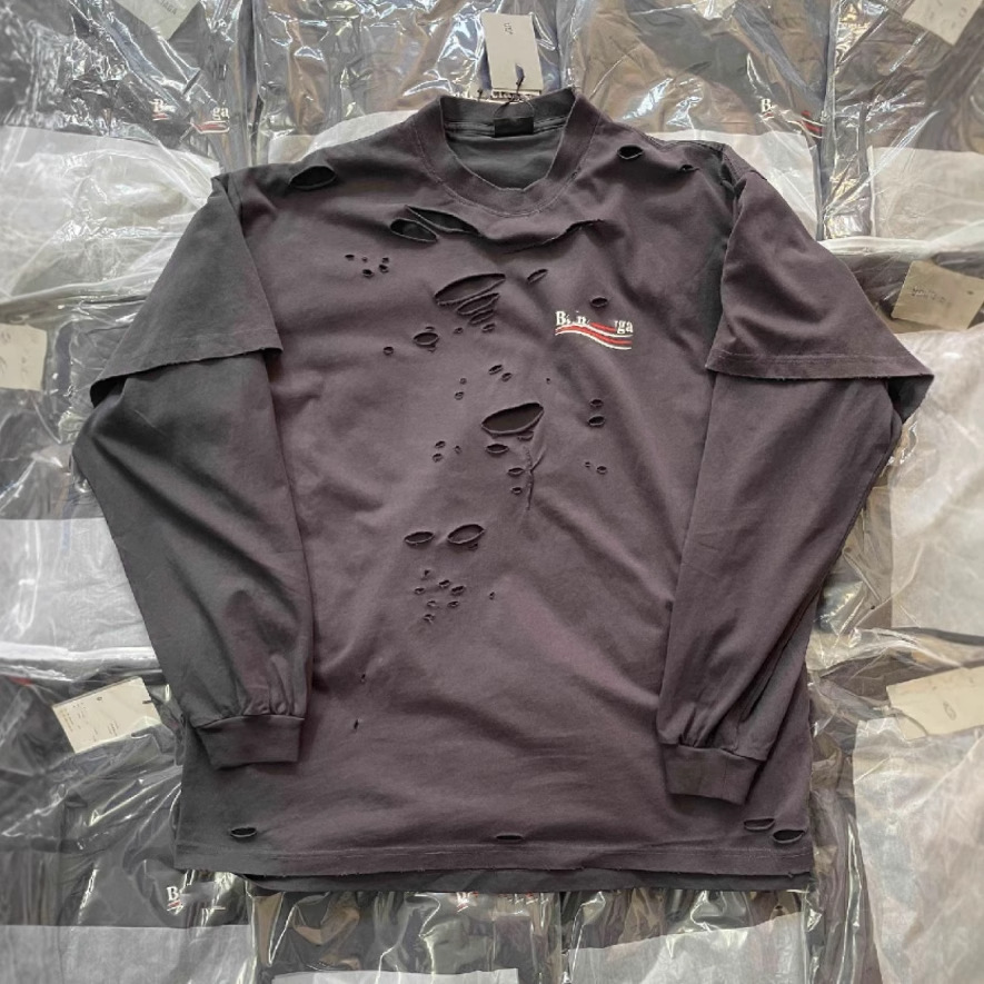 Ceiling Poison オリジナル パリ B フェイクツーピース コーラ刺繍 ダメージ加工 リップルシルエット 長袖 Tシャツ 男女兼用