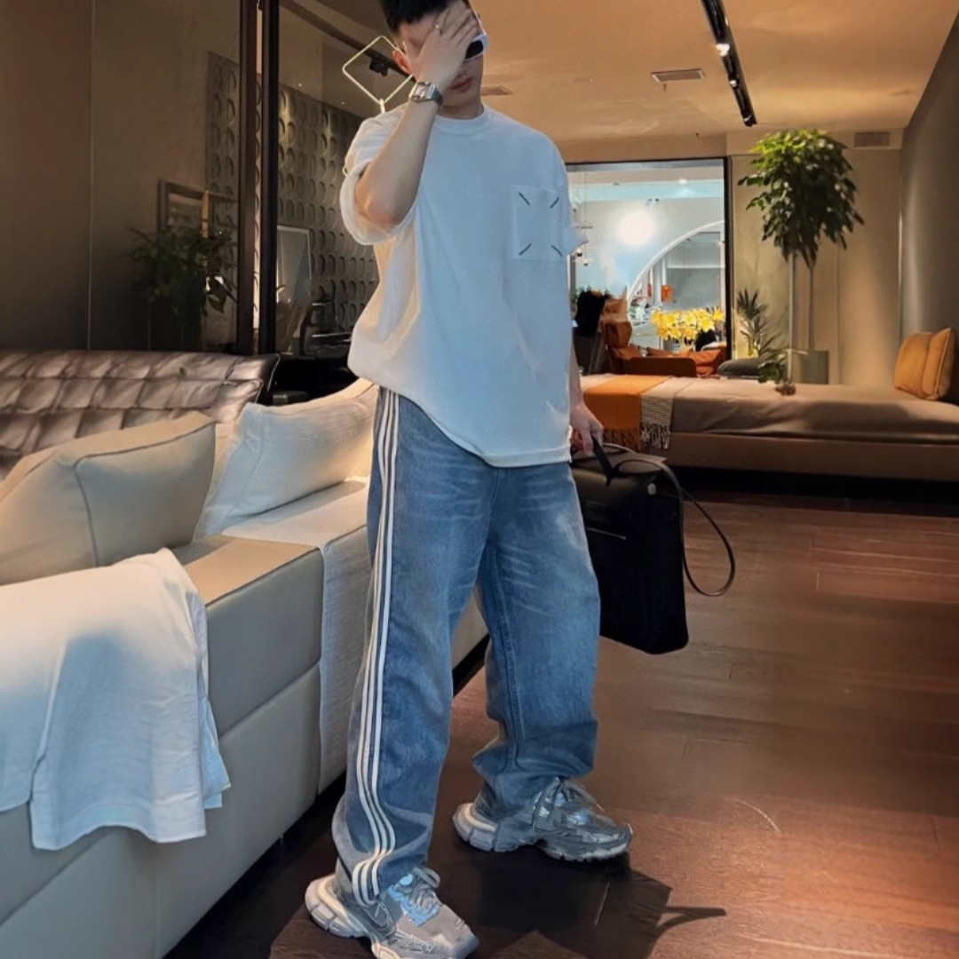 新款巴黎B家渐变三道杠阔腿牛仔裤网红男女水洗做旧宽松牛仔长裤