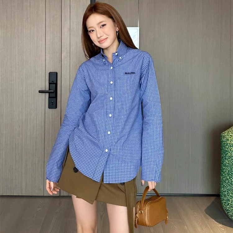 Nanyou 高品質オリジナル標準 SS25 初秋新作 MIU ホームレター刺繍チェック柄チェック柄シャツブルーシャツ