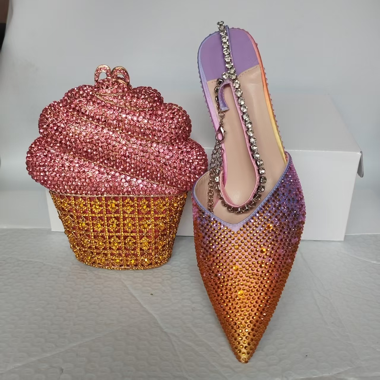 2025 レディース ハイヒール イブニング バッグ セット ポインテッドトゥ ハイヒール サンダル リボン ダイヤモンド ハンドバッグ バンケットバッグ