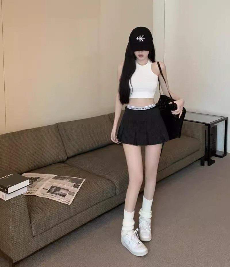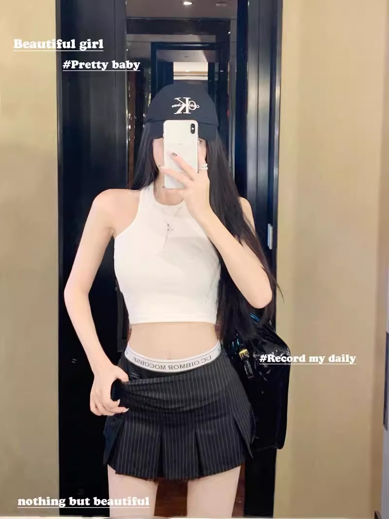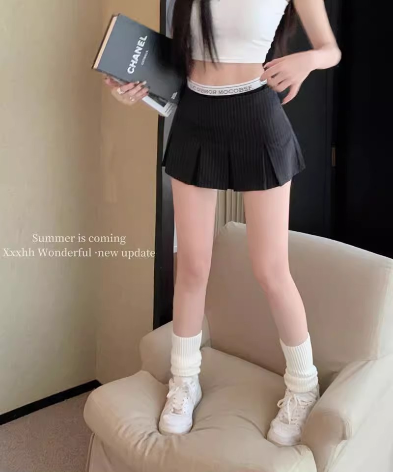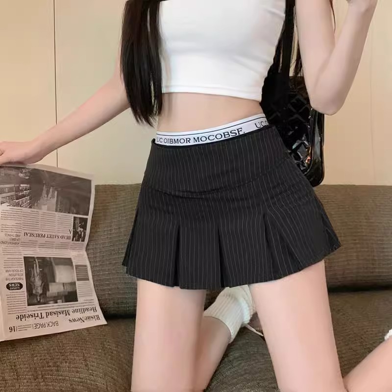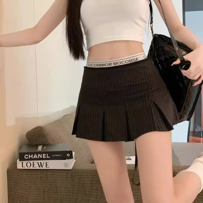 アメリカンレトロストライププリーツローウエストスーツスカートレディース夏スリムフィット甘辛Aラインヒップスカート