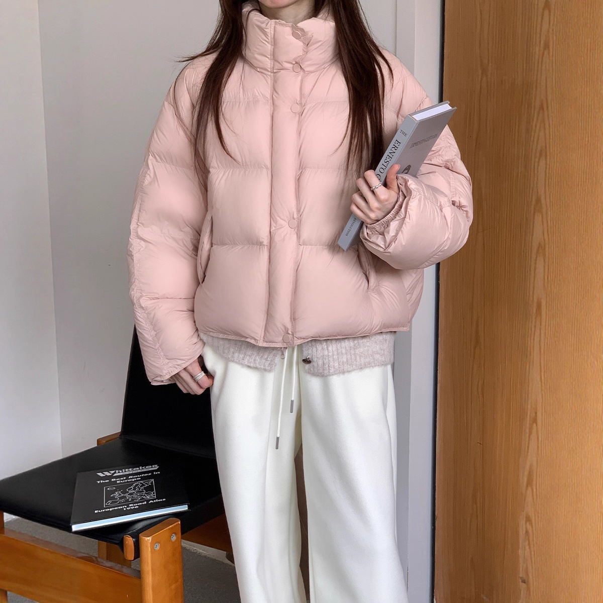 薇颂2025新款冬季女装粉色立领白鸭绒羽绒服女款保暖面包服外套