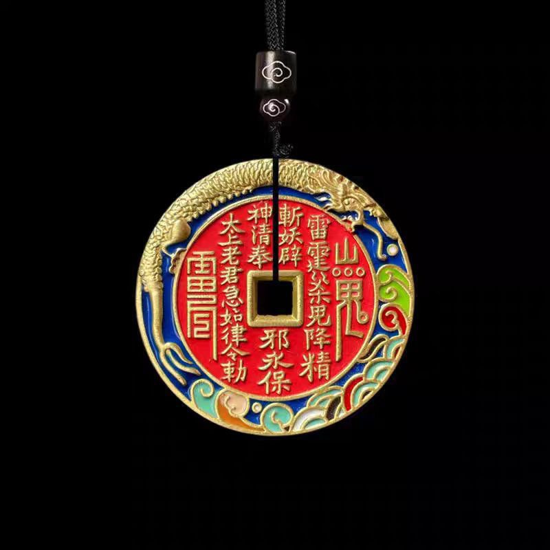 真鍮製ドラゴンレリーフ四海山鬼金貨ペンダント、エナメル工芸銅貨ペンダント、角穴付き山鬼銅貨ネックレス
