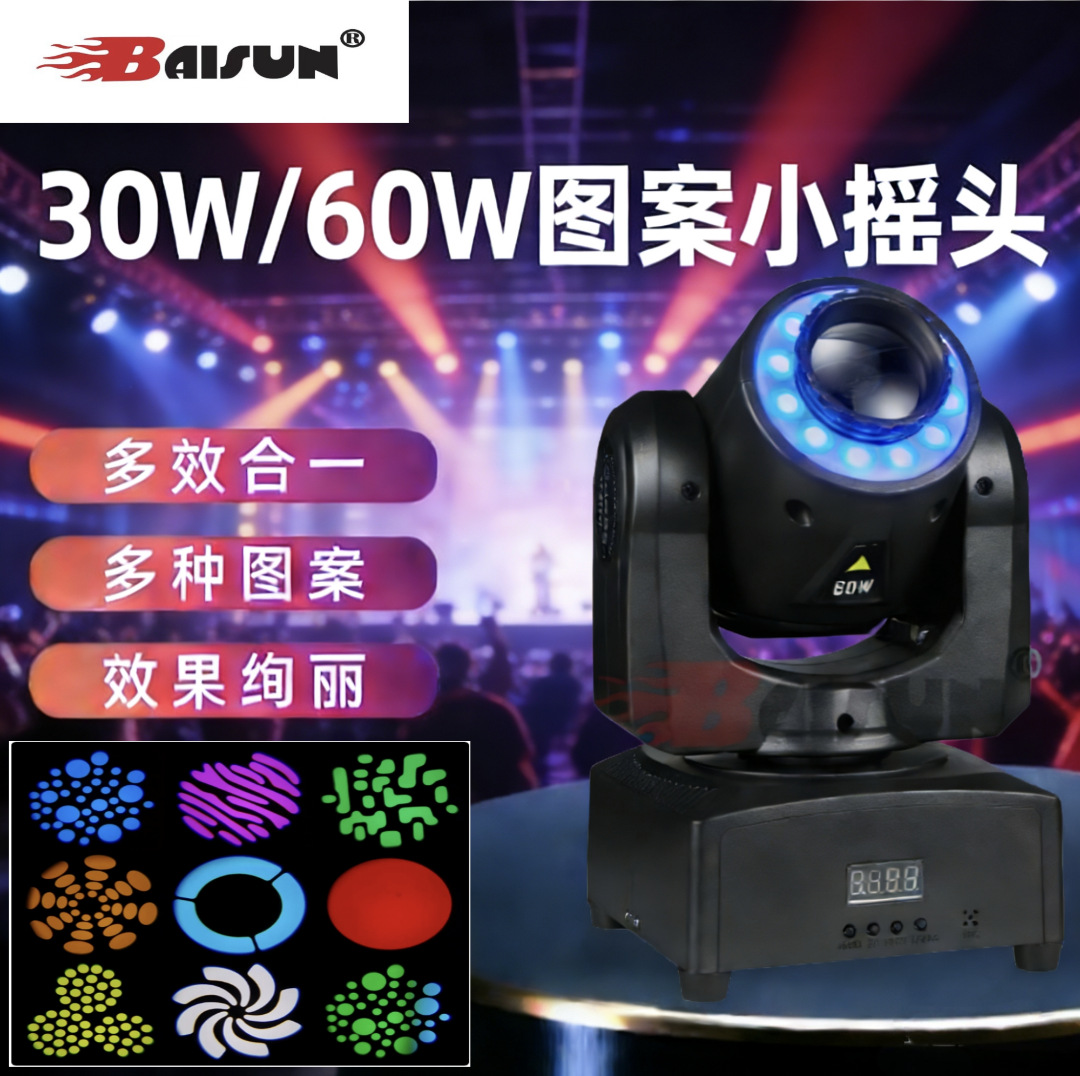 新型30W/60Wパターン小型ムービングヘッドライト、絞り付きステージ照明、ビームライト、染色ライト、ムービングヘッド照明器具