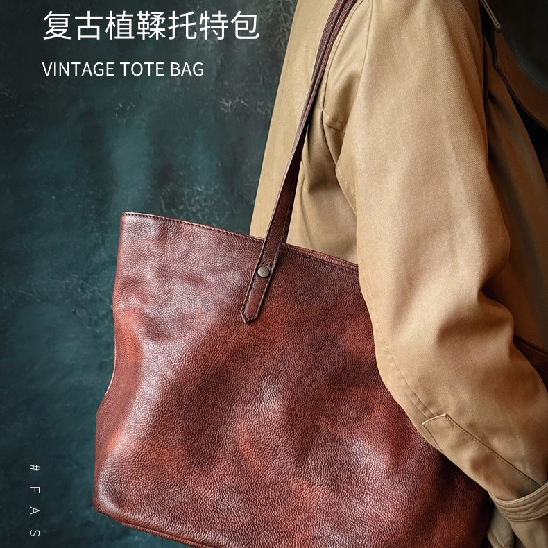 J6简约大容量通勤多隔层托特包头层植鞣牛皮复古休闲百搭单肩6530