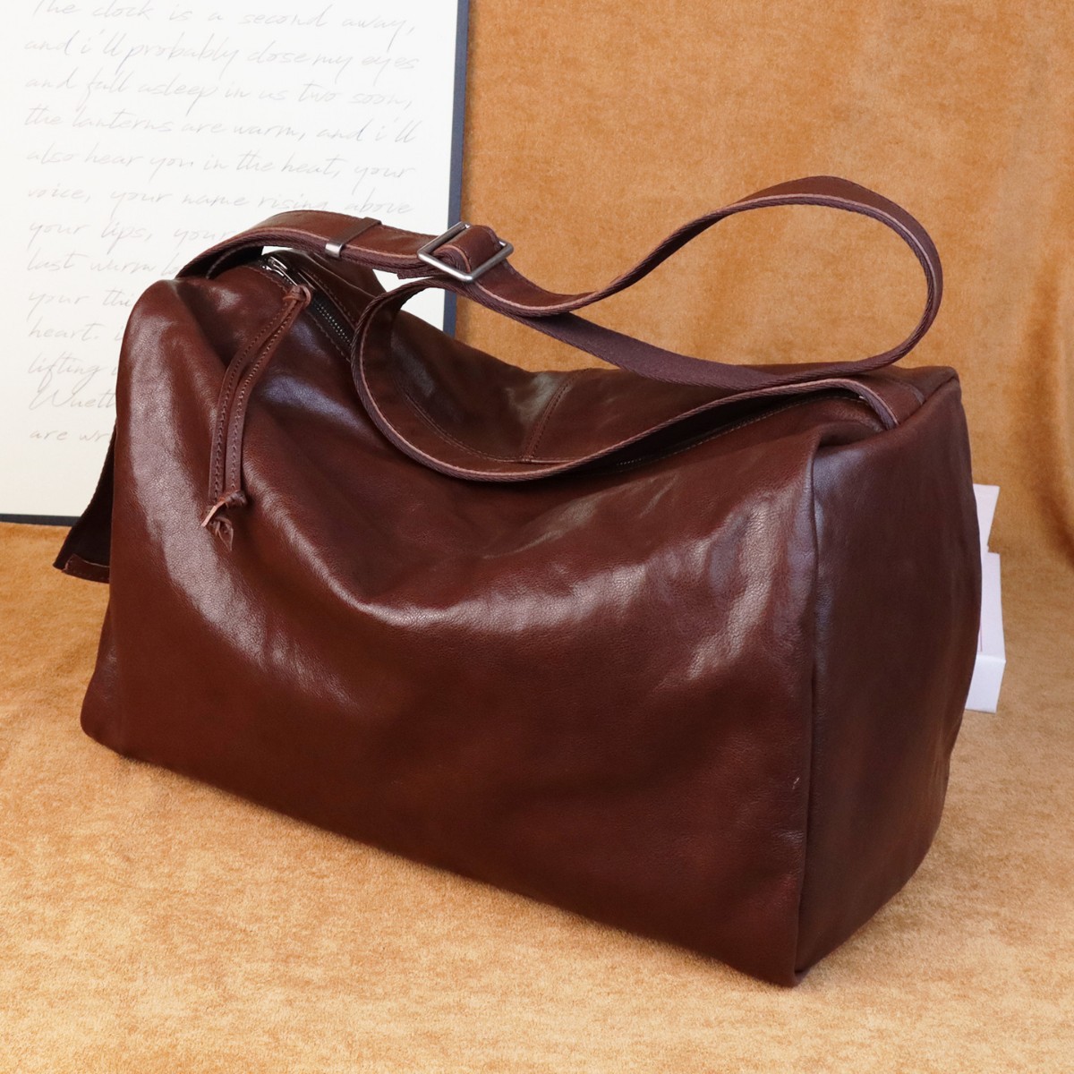 J6极简头层植鞣牛皮大容量斜跨通勤健身包头层牛皮法棍旅行包7808