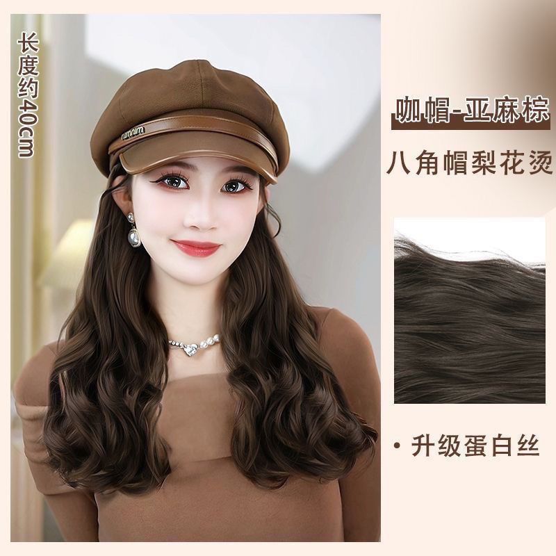 翊朵假发气质女神假发帽时尚八角帽假发一体逼真自然大波浪卷发